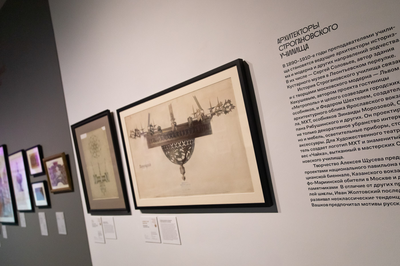 Говоря о синтезе искусств, нельзя не упомянуть Федора Шехтеля. В дореволюционной Строгановке преподавала плеяда великих архитекторов — это сам Шехтель, Лев Кекушев, Сергей Соловьев, Иван Жолтовский, Алексей Щусев, — которые привлекали для работы над своими объектами великих живописцев. Константин Коровин по приглашению Федора Шехтеля оформлял майоликовыми и живописными панно фасады и интерьеры Ярославского вокзала в Москве. Щусев привлекал художников к оформлению Казанского вокзала и сделал рельефные створки дверей для национального павильона в Венеции в 1914 году. Эскизы этих створок в натуральную величину можно увидеть на выставке.