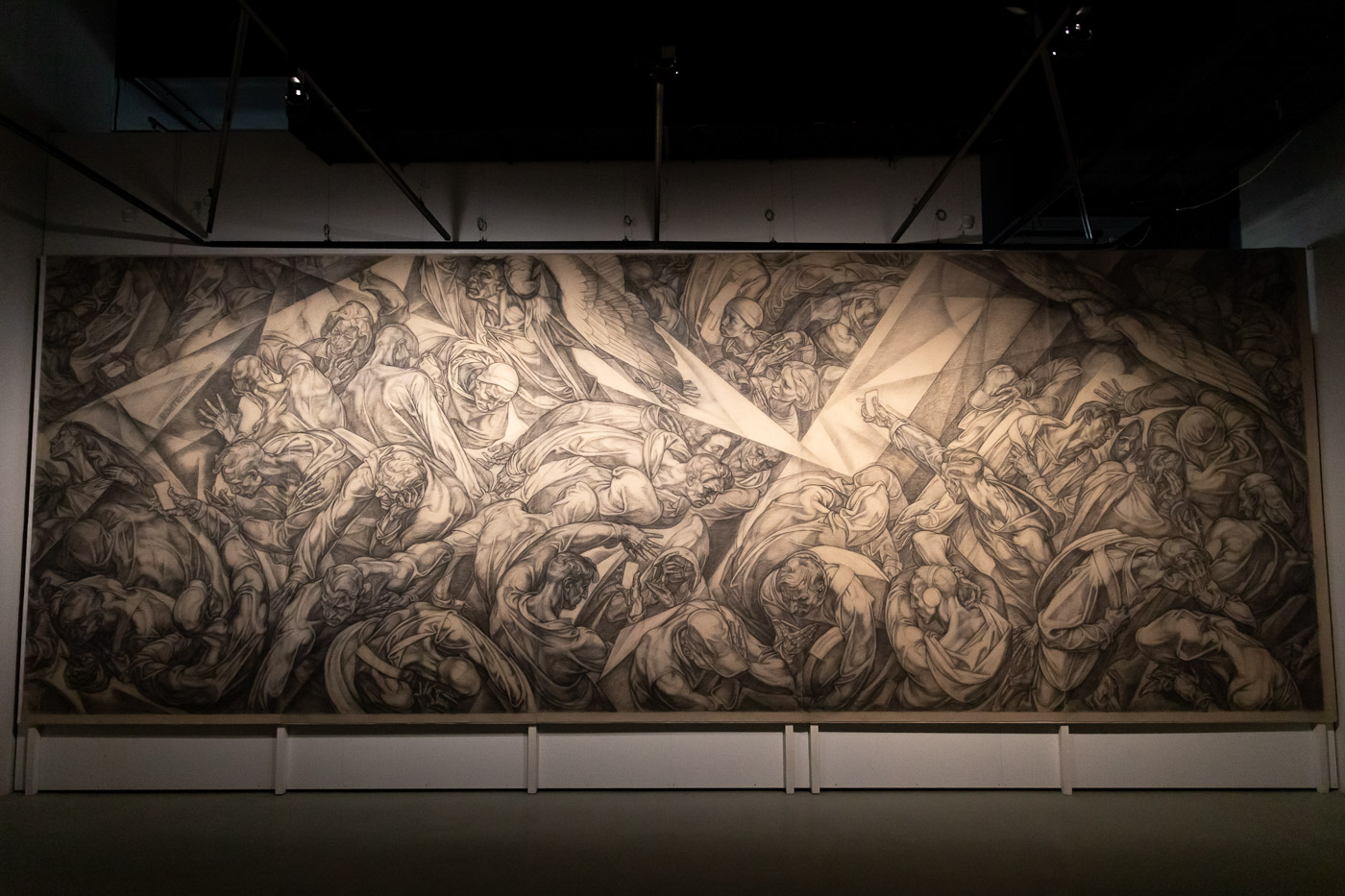 Завершающая точка экспозиции — шестиметровый фрагмент монументальной росписи Валерия Чернорицкого, который руководил кафедрой монументальной живописи Строгановки. Пока люди спускаются в метро по эскалатору в абсолютной суете, над ними пролетают то ли птицы, то ли ангелы. Все это напоминает путешествие Данте и Вергилия в Ад из «Божественной комедии». Это мощный рисунок, эпический язык монументального полотна. На выставке представлена его меньшая часть, высота всего произведения — 12 метров. Художник создавал эту композицию, не отрываясь от стены, — как Микеланджело, расписывавший свод Сикстинской капеллы.
