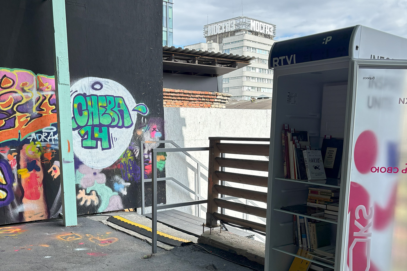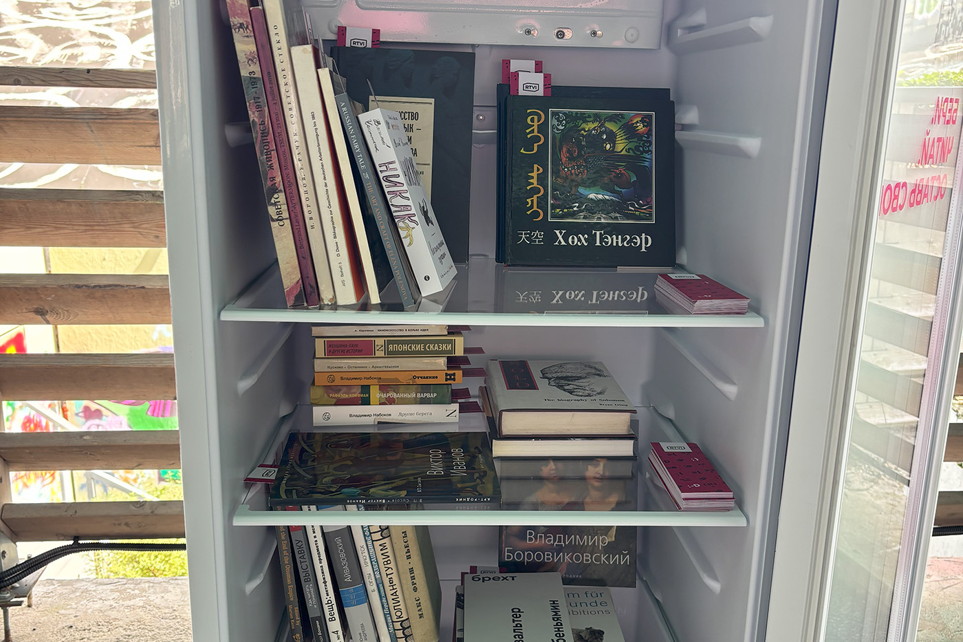 Среди книг, доступных в буккроссинг-библиотеке: Василий Чистюхин — «Никак. Как стать успешным художником» (Individuum, 2025), Вальтер Беньямин — «Брехт» (Ad Marginem, 2025), Джон Бёрджер — «Красная штора Болоньи» (Ад Маргинем Пресс, 2025), Вилем Флюссер — «О фотографии» (Ad Marginem, 2025), Александр Бренер — «Три дыни в пустыне» (Издательство книжного магазина Циолковский, 2021) и другие. Желающие могут брать любые понравившиеся книги и приносить на полку свои.
