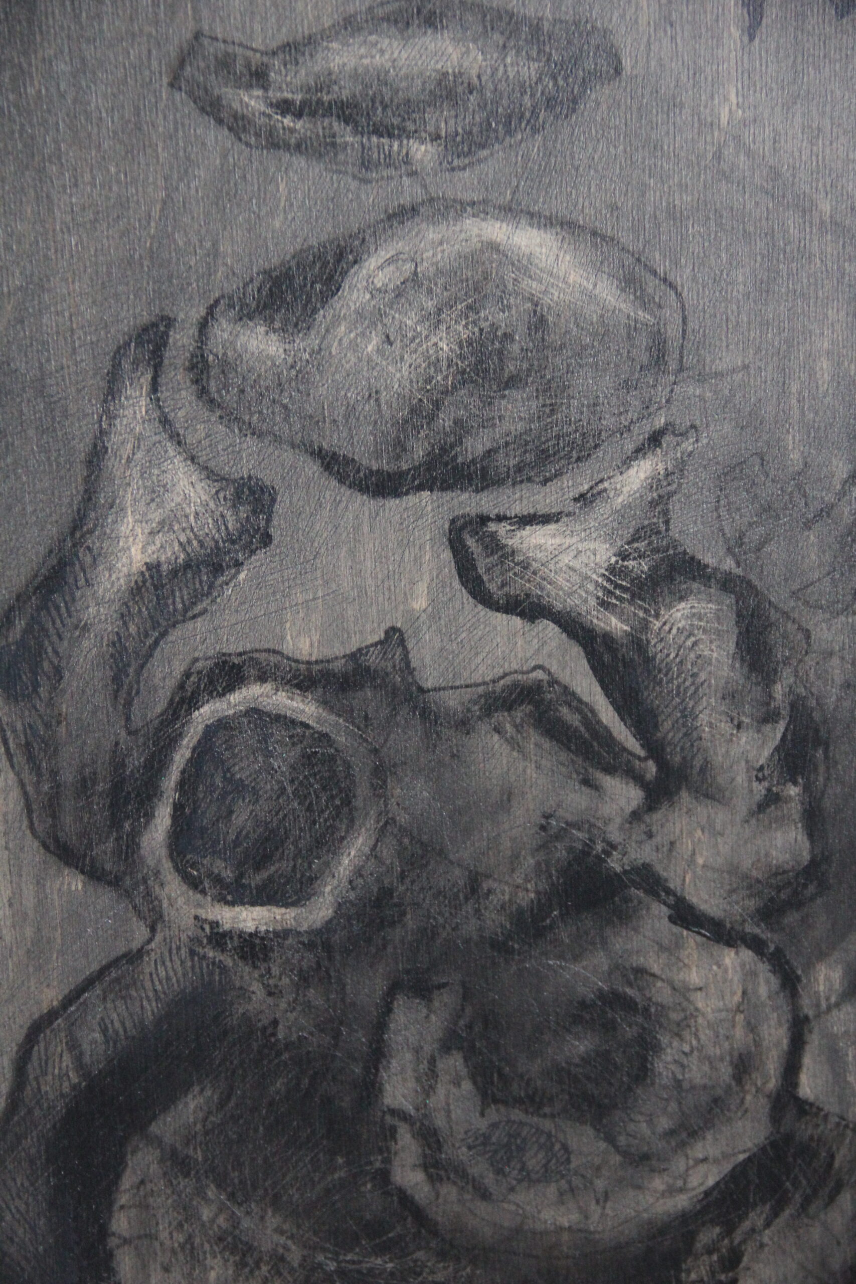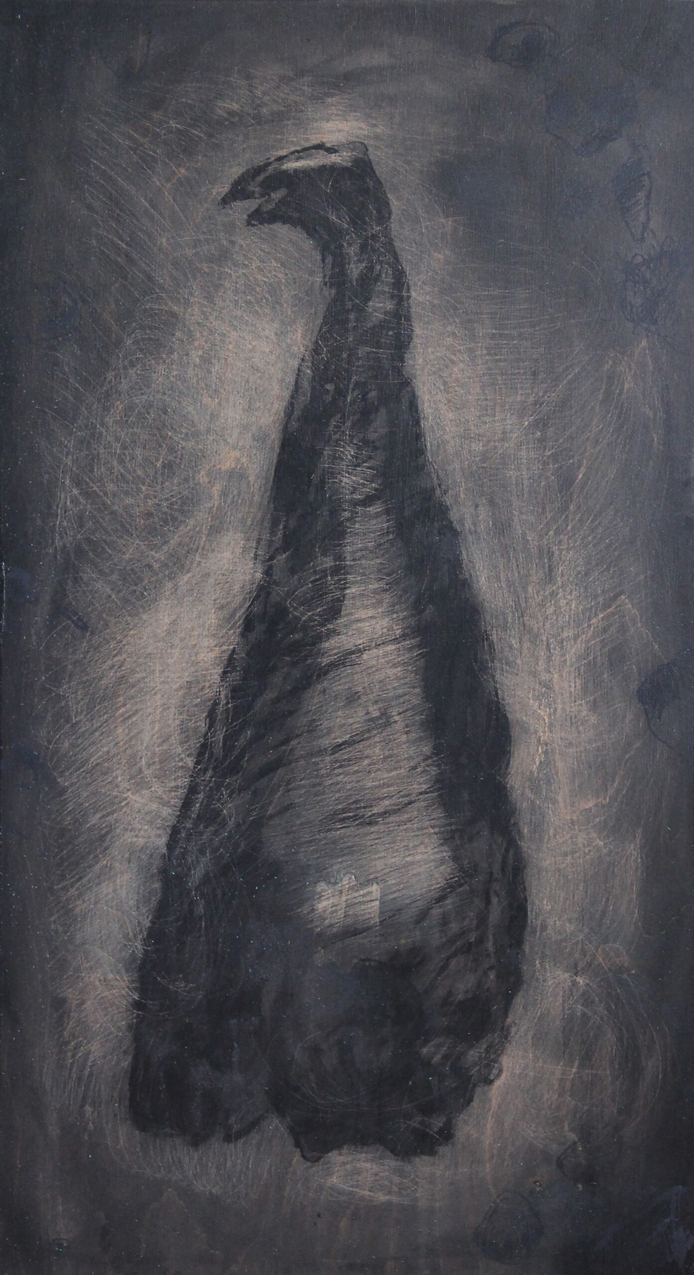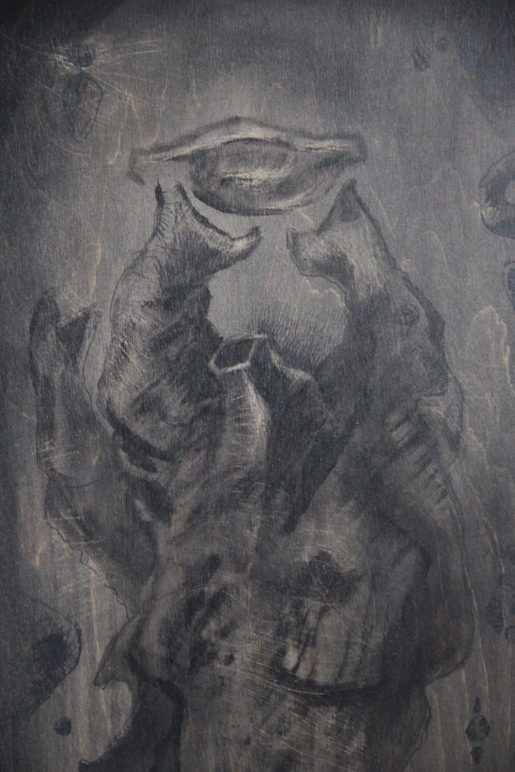 В новой экспозиции фанера, ранее использовавшаяся для объемных скульптур и инсталляций, становится поверхностью для нанесения графического изображения с помощью кистей, акриловых маркеров и металлических щеток. Метод процарапывания подчеркивает слоистость и отсылает к структуре земли. В серии «Землеродные» представлены нечеловеческие подземные существа, в серии «Откровения» — силуэты птиц, один из повторяющихся образов в практике автора.