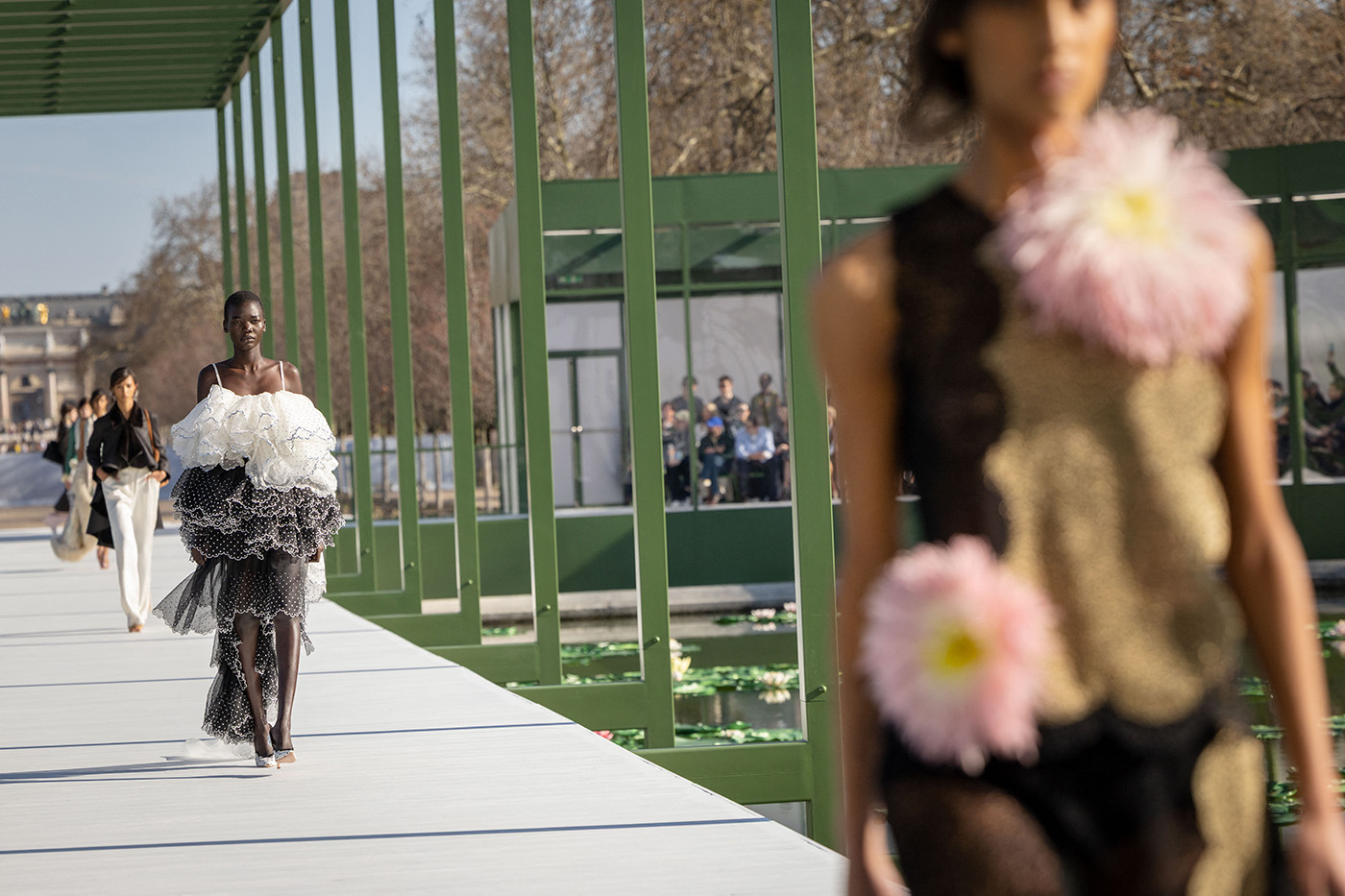 На этот раз декорация получилась особенно выразительной. Подиум построили вокруг восьмиугольного бассейна Bassin de l’Octogone, где плавают кувшинки, а над водой возвели огромную стеклянную конструкцию, похожую на оранжерею. В солнечный день это выглядело почти импрессионистской сценой: свет отражался от воды, нежные лепестки кувшинок перекликались с фактурами тканей, а парк вокруг продолжал жить своей обычной жизнью. Прохожие гуляли по гравийным дорожкам, а гости показа сидели под прозрачной крышей, словно наблюдая за модой изнутри огромного сада.