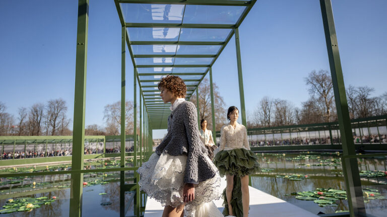 На этот раз декорация получилась особенно выразительной. Подиум построили вокруг восьмиугольного бассейна Bassin de l’Octogone, где плавают кувшинки, а над водой возвели огромную стеклянную конструкцию, похожую на оранжерею. В солнечный день это выглядело почти импрессионистской сценой: свет отражался от воды, нежные лепестки кувшинок перекликались с фактурами тканей, а парк вокруг продолжал жить своей обычной жизнью. Прохожие гуляли по гравийным дорожкам, а гости показа сидели под прозрачной крышей, словно наблюдая за модой изнутри огромного сада.