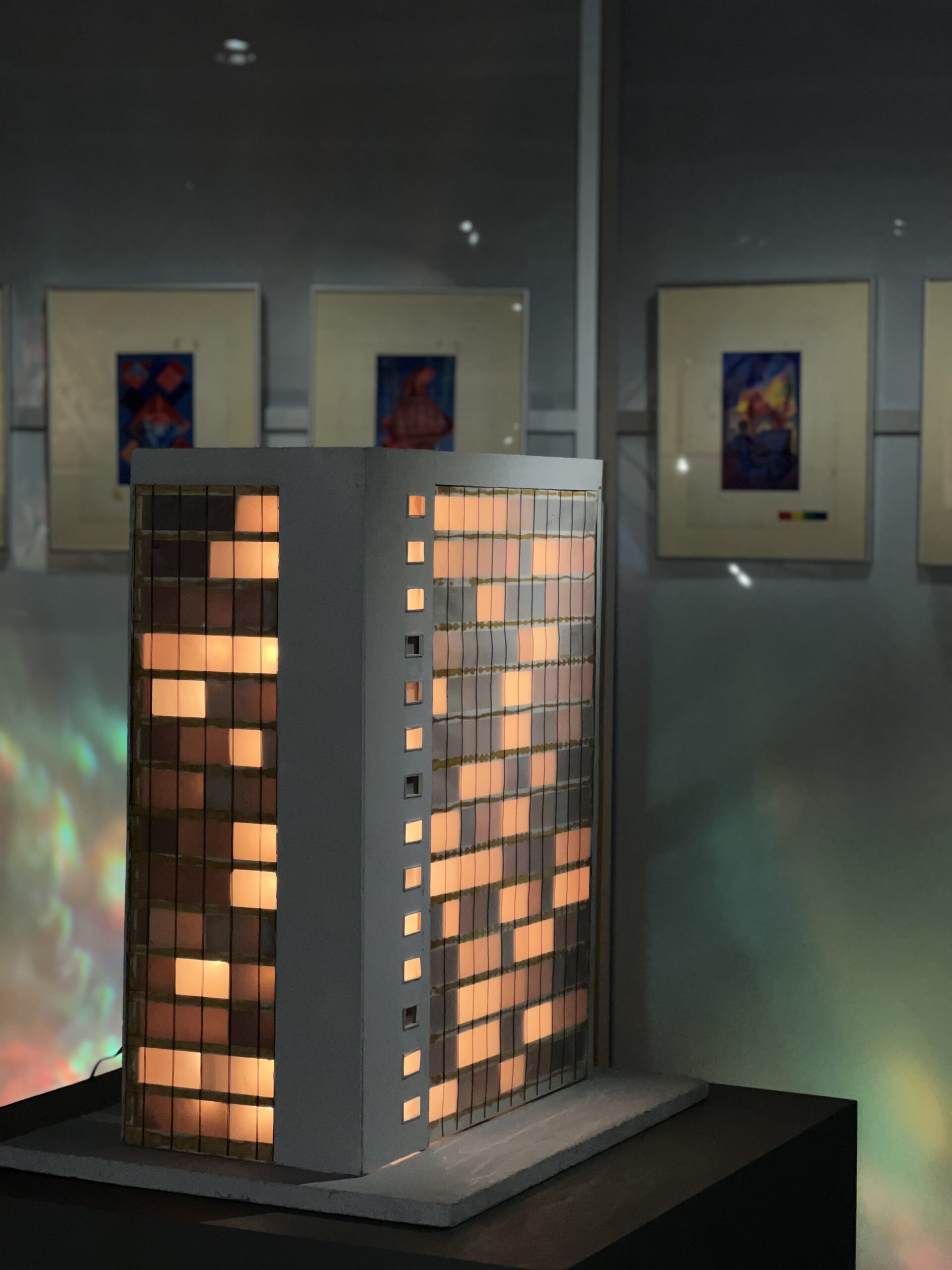 — Экспозиция «Темной Оттепели» была очень последовательно выстроена, и мы постарались вслед за ней также начать с городского пространства. Если на минус первом этаже «Темной Оттепели» была воссоздана мрачная городская среда для непризнанных художников, то здесь мы попытались показать светлый город, светлое пространство, которое пытались воссоздать в 1960-1970-е годы. Это первые проекты по световой архитектуре, световому дизайну.