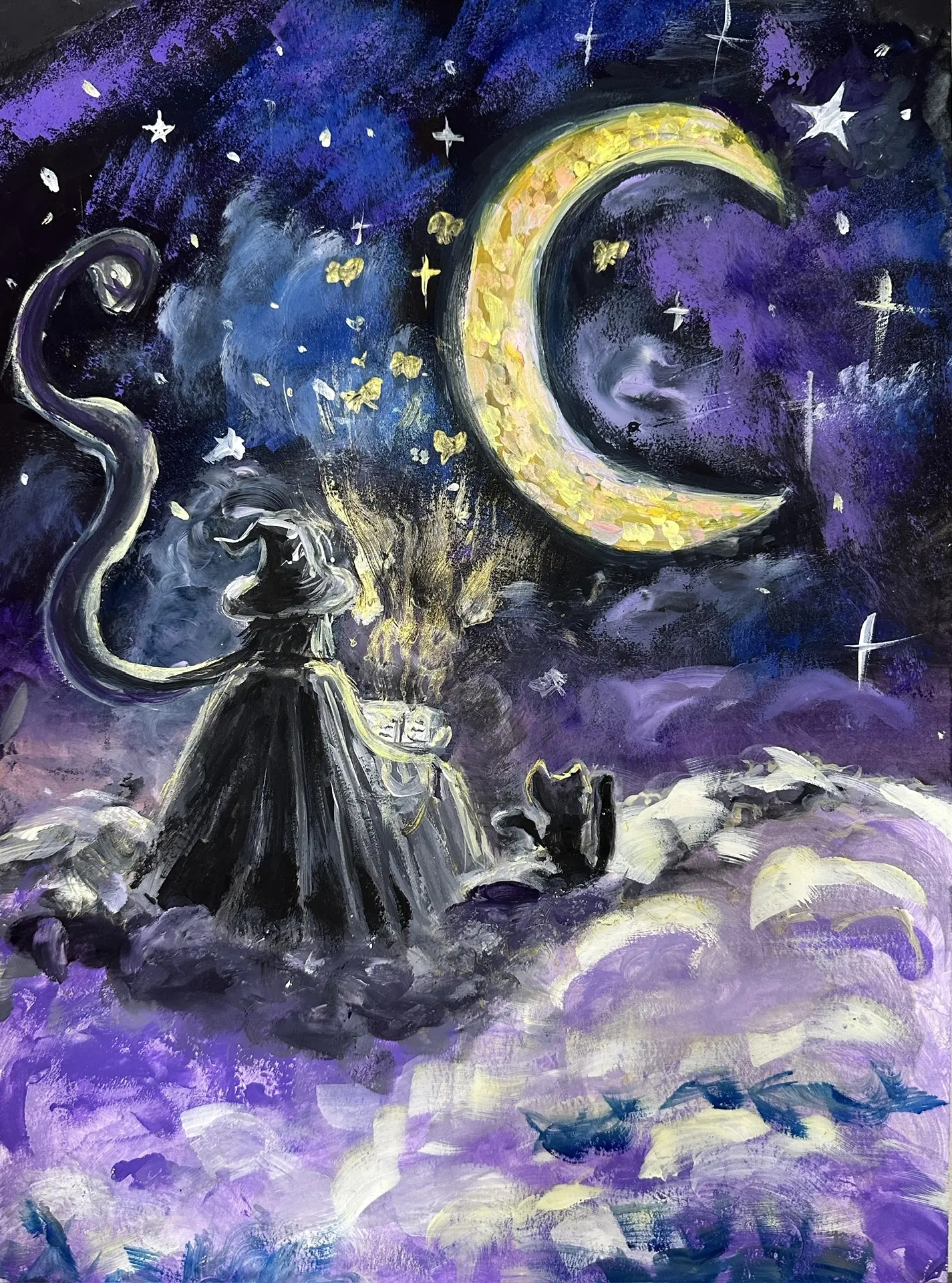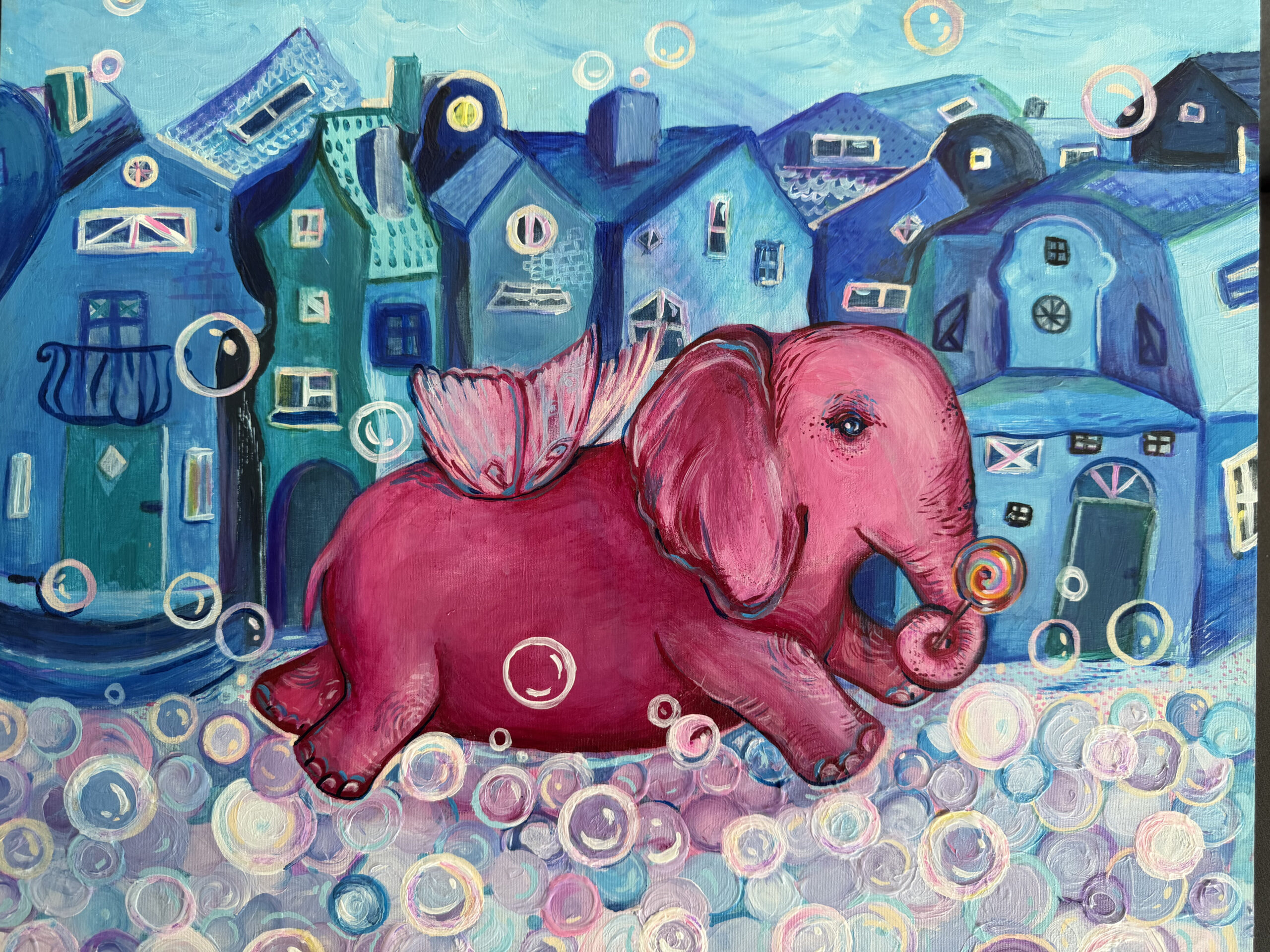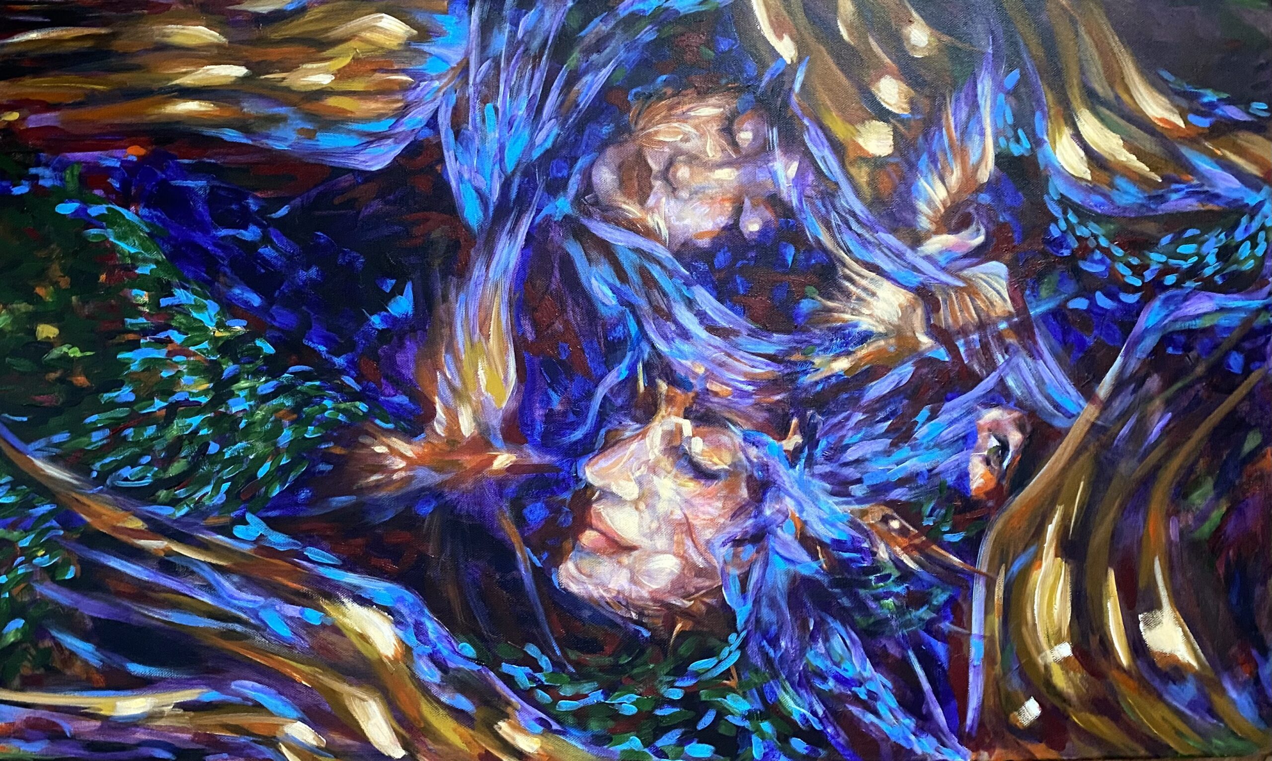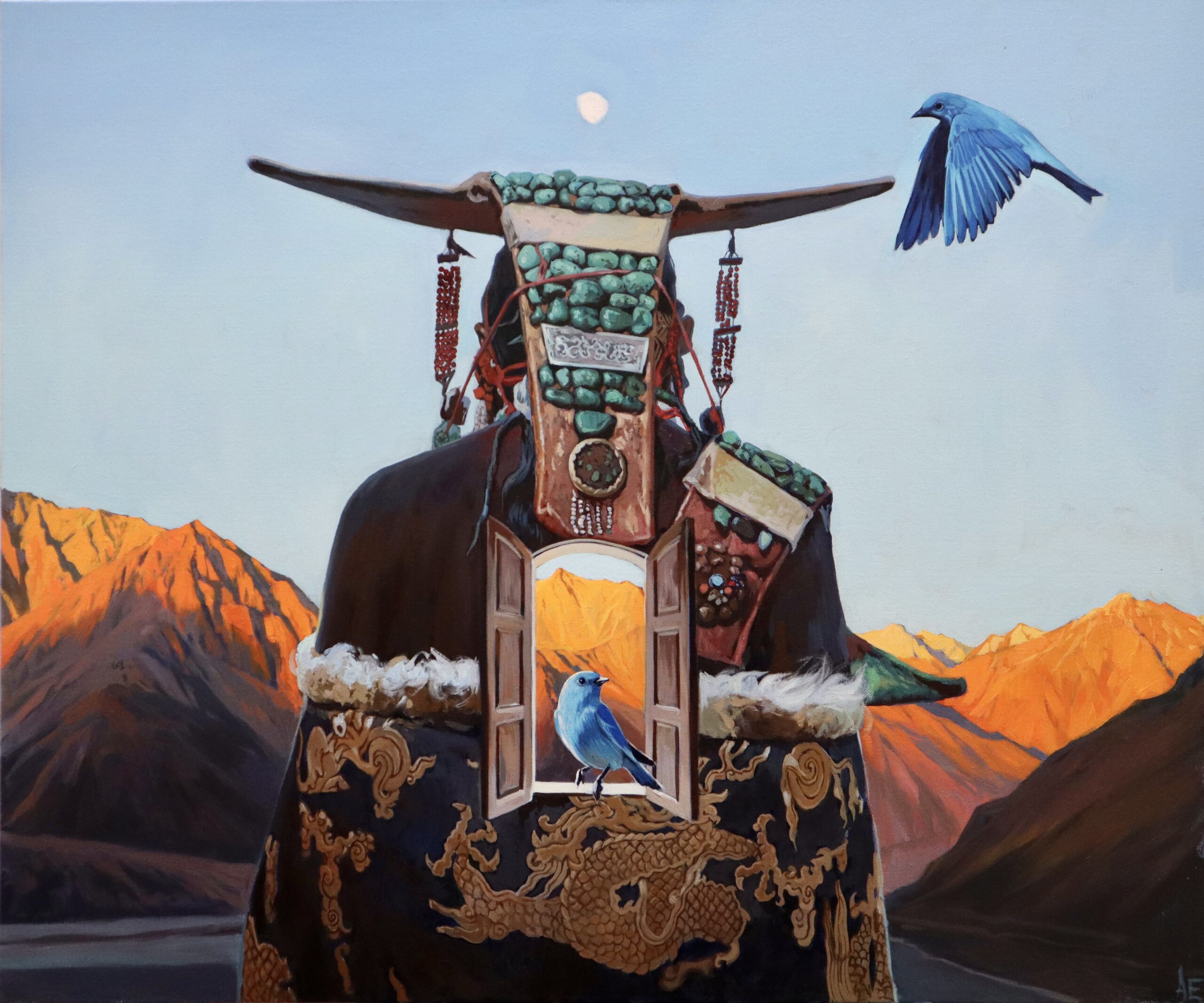 Проект «Дом» обращается к идее внутреннего пространства, которое не зависит от географии. Это попытка визуализировать ощущение принадлежности — к роду, традиции, друг к другу. В серии «Путь души» художница исследует метафору вечного движения. Сквозные образы: Синяя птица (душа в поиске), Портал (граница между мирами), женские косы (связь поколений). Они не иллюстрируют ответы, но приглашают зрителя к размышлению. Специально для ярмарки создана инсталляция «Портал» с наличником XIX века из Городца. Предмет крестьянского быта становится смысловым центром, соединяющим прошлое и современное, личное и всеобщее.