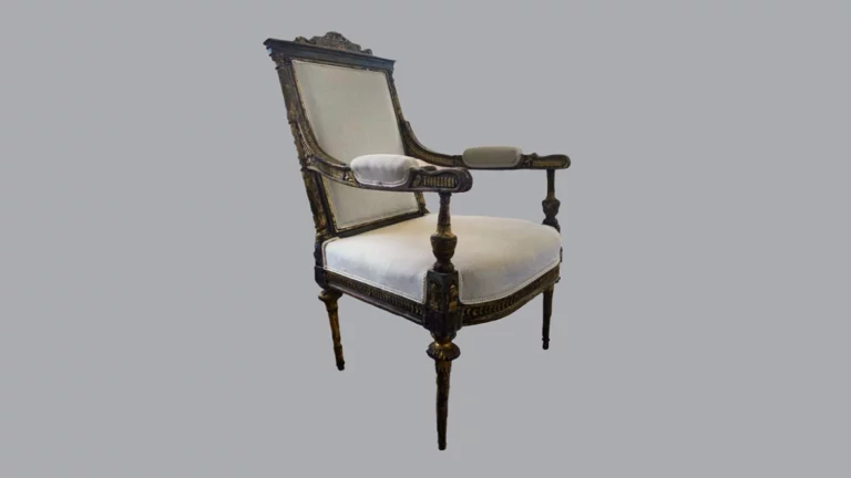Особенностью кресла является его оригинальная форма, сочетающая элементы французского кресла эпохи Людовика XVI с характерными деталями: стойками локотников в виде вазочек, декорированными колонками спинки и точеными ножками с капителями. Исторический анализ показал, что в 1870-1880-х годах предмет был полностью покрыт черной лаковой краской, под которой сохранились оригинальная позолота и голубая раскраска деталей.