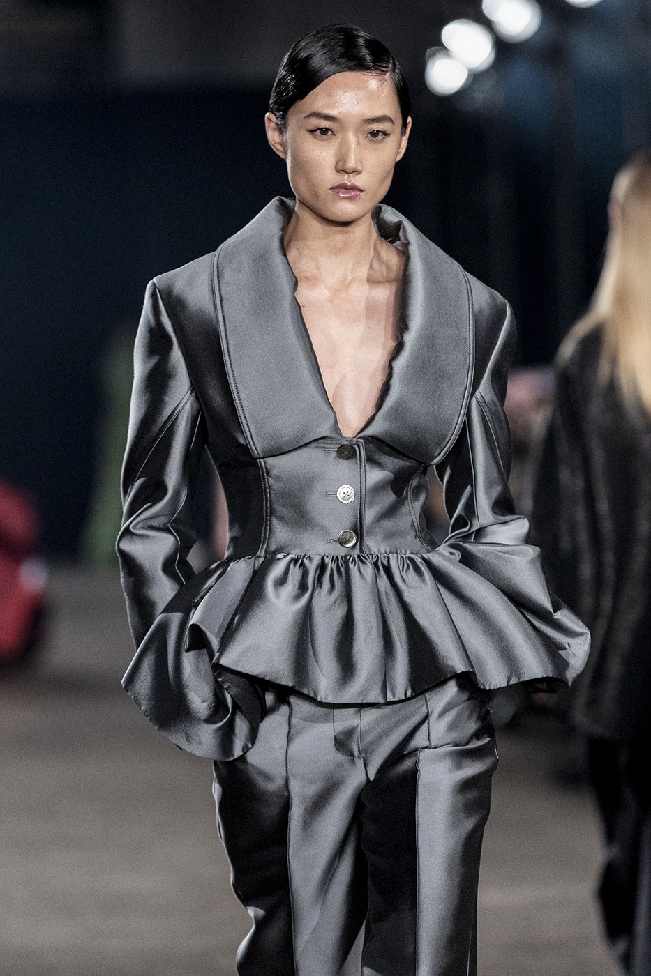 Еще один вариант акцента на талии, но уже в нарядном образе, — баска. Пышные воланы по низу топов и блуз были на пике популярности полтора десятилетия назад, теперь тренд родом из 2010-х возвращается, но не один-в-один, а в новом прочтении. Если раньше баску дополнял узкий лаконичный лиз вроде джинсов скинни и юбок-карандашей, то теперь дизайнеры предлагают носить их с расслабленными широкими брюками-палаццо. Чтобы не вышло слишком перегружено объемами, лучше ограничить цветовую палитру наряда монохромом (посмотрите на брючные костюмы в коллекции Christopher John Rogers) или классикой «белый верх, черный низ», как у Ashlyn. Получится хорошая смесь нарядности, небрежности и строгости.