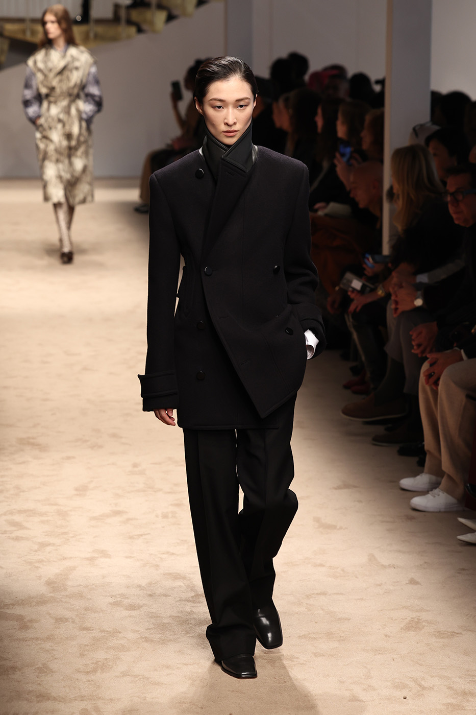 Еще немного о маленьких приемах, которые помогают сохранить легкость и экспериментальность в отношениях с одеждой даже в непростое зимнее время. Как правило, верхней одежды в наших гардеробах не так много, и не каждая может похвастаться десятком пальто под разные настроения. Хорошая новость в том, что даже одно-единственное любимое можно носить несколькими разными способами. Этой зимой, например, дизайнеры напоминают: отложной воротник поднимается, одновременно защищая от ветра и непогоды и придавая привычным предметам гардероба новый вид. Нередко нижняя сторона воротника сшита из другого материала, и возникает дополнительный цветовой акцент: так, у Dries Van Noten графитовый пиджак контрастирует с белой полоской воротника, а у Tod’s заметна разница фактур.