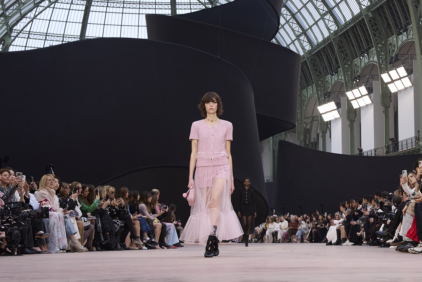 И пара цветных штрихов к пестрой палитре зимних трендов. Обычно к холодному времени года в коллекциях начинают превалировать темные, глубокие и благородные оттенки вроде малахитового, шоколадного и бордового (последний, кстати, в этом сезоне тоже очень в чести, но речь сейчас не о нем). И тут неожиданно на авансцену выходит светло-розовый — не тот, что задавал лейтмотив барбикора, но более нежный, немного детский, напоминающий о сахарной вате, зефире и чем-то неуловимо-праздничном. Chanel выпускают в этом оттенке несколько вариантов твидовых костюмов, Emilia Wickstead и Jil Sander показывают нарядные платья, а Miu Miu добавляют простые розовые лонгсливы в повседневные образы с офисными юбками, потому что зимние будни особенно требуют толики праздника.