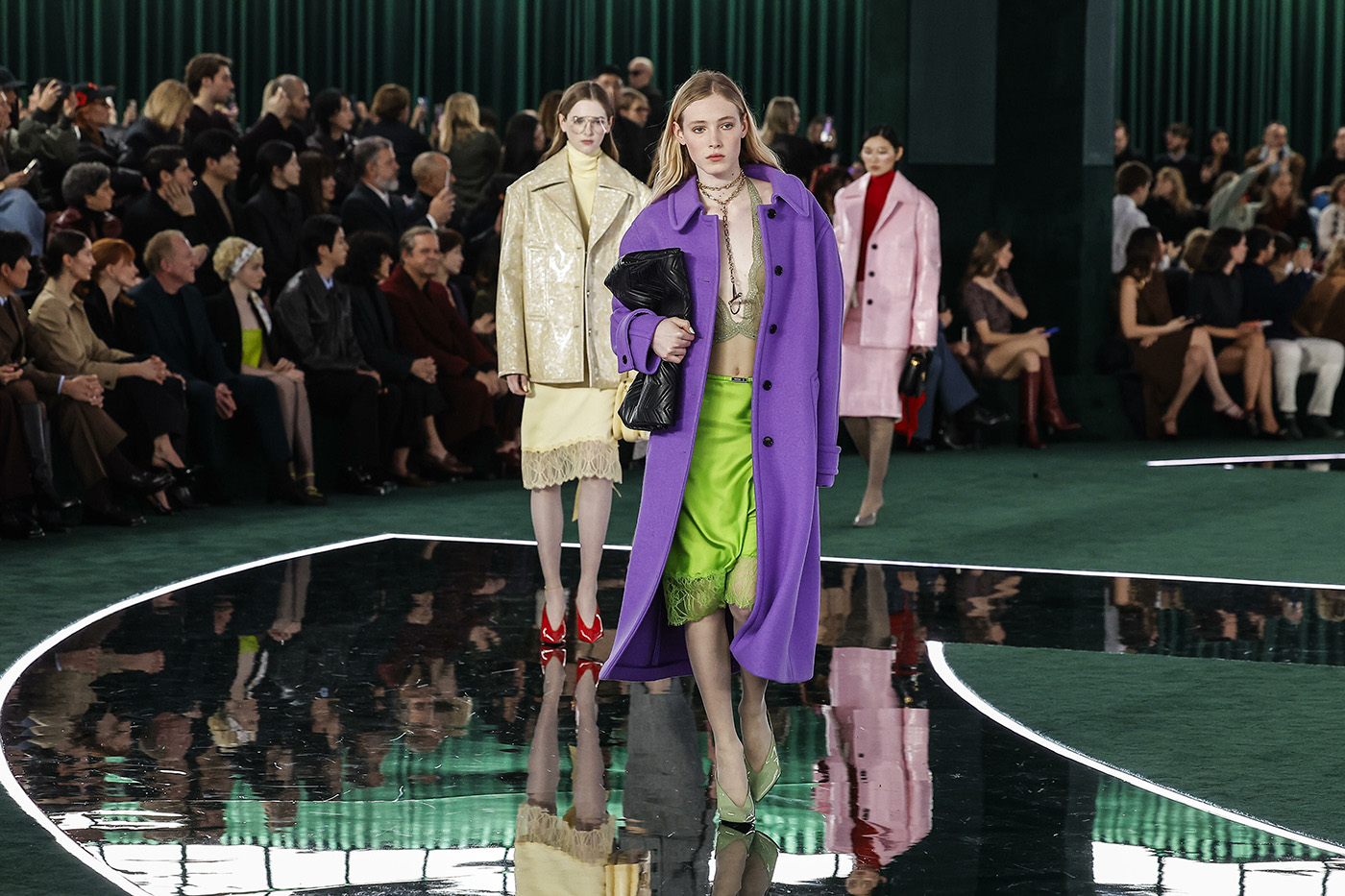 Но вообще трендовые цвета лучше всего работают даже не сами по себе, а в сочетаниях, дополнительных или контрастных. Один из ключевых оттенков сезона — фиолетовый (его мы видим в разных вариациях у множества брендов, от VIvienne Westwood до Altuzarra), и его дизайнеры предлагают оттенять контрастными цветами вроде травянисто-зеленого и светло-желтого. Так, у Gucci из-под фиолетового пальто видна неоново-зеленая оторочка шелковой юбки (кстати, помните про парадоксальный кружевной тренд?), а у бельгийской марки Meryll Rogge из-под холодного сине-фиолетового костюма выглядывают детали блузы в оттенке неаполитанской желтой. Получается очень свежо и даже как-то по-весеннему, потому что, будем честны, по весне начинаем скучать сразу после новогодних праздников.