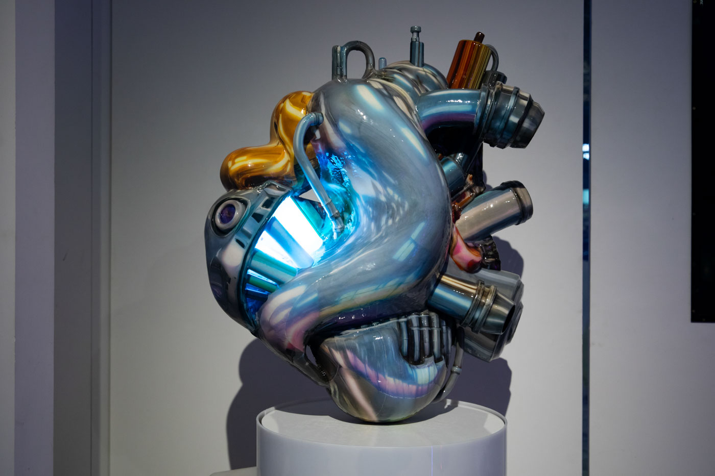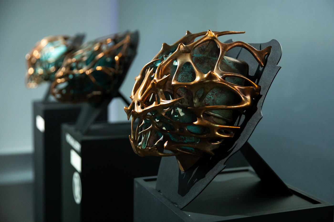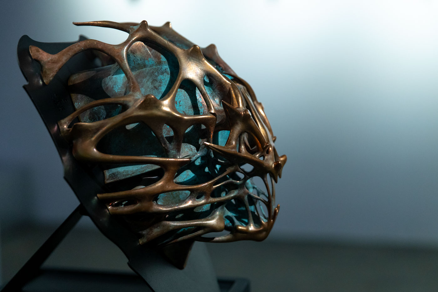 В центре экспозиции — два ключевых объекта. Кинетическая инсталляция Crypto Spore Низамутдиновой отсылает к гипотезе панспермии: застывшая форма фиксирует миг первичного контакта, где энергия, информация и материя соединяются, чтобы запустить новые эволюционные сценарии. Объект Чернышева «Инфочеловек», напротив, обращен в будущее, где человек превращен в узел глобальной информационной сети.