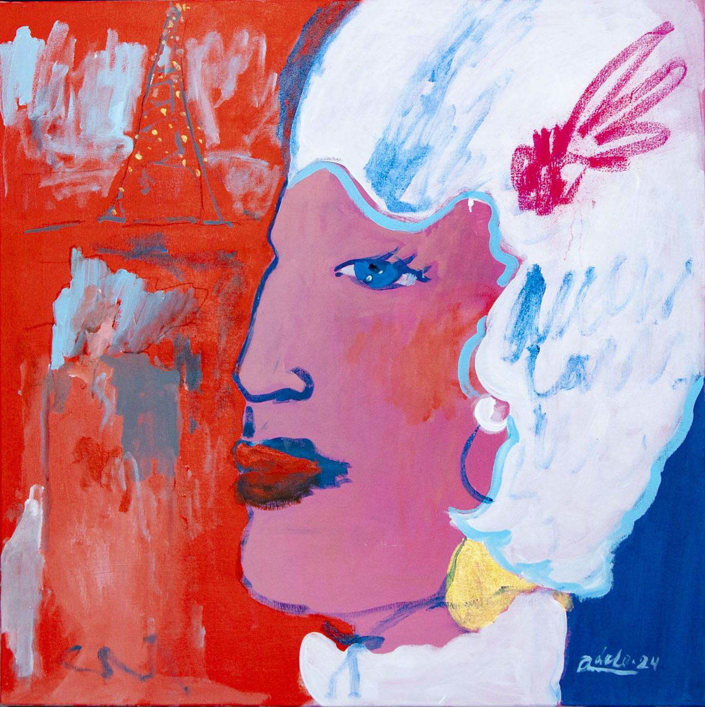 Дерзкий и броский портрет женщины в белом парике вырастает на фоне алой театральной занавеси — то ли Парижской оперы, то ли города, утопающего в мареве закатного солнца, за час до бала. В ее облике смешаны вызов и игра, предчувствие праздника и тайна еще не начавшегося вечера.