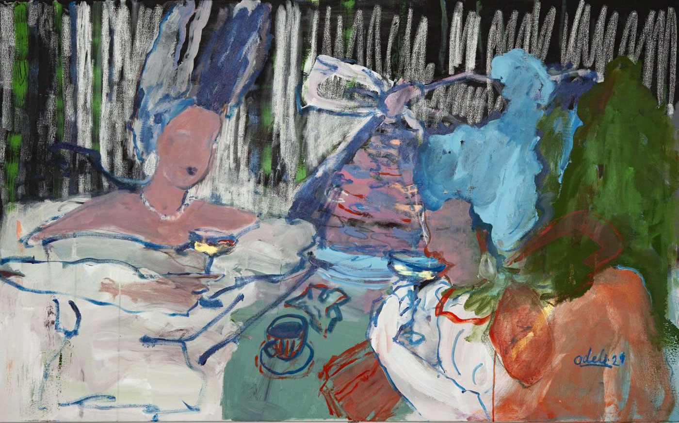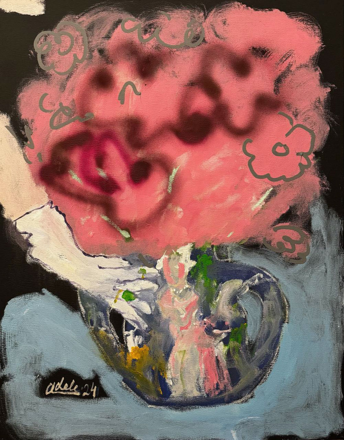 В этой работе Адель переносит «бал пиона» в пространство современного натюрморта: пышная, почти облачная шапка розовых лепестков разрастается до границ холста, а вместо камерной букетной точности остается ощущение движения, дыхания и послевкусия праздника.