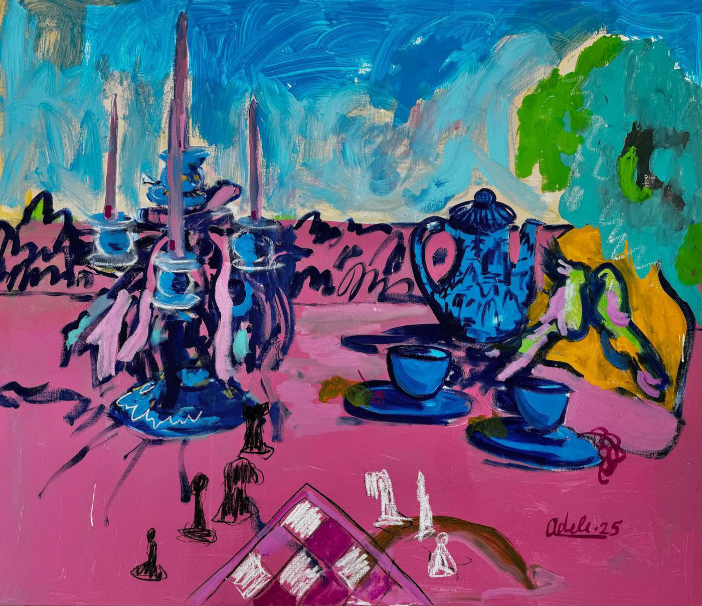 Праздная жизнь балов стихает, мгновение назад — цепляясь, пошатываясь и хохоча хрустальным смехом, милые дамы убежали под раскаты салюта. Адель превращает исчезнувшее движение в театральную, зыбкую декорацию: на розовом «подиуме» — сервиз, шахматные фигуры и тяжелый подсвечник с розовыми свечами, которые словно продолжают диалог, но уже без людей. Все пространство выглядит как сцена, на которой остались лишь реквизиты после бала.