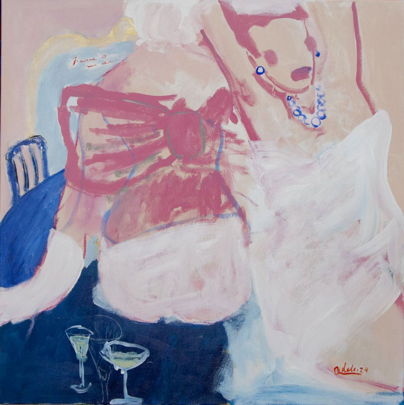 Эта работа про бесконечное ощущение праздника — то легкое время, когда все только начинается. Атмосфера картины напоминает о вечерах, когда подруги собирались у кого-то дома за бокалом игристого, делились секретами и смеялись, предвкушая танцевальную ночь.