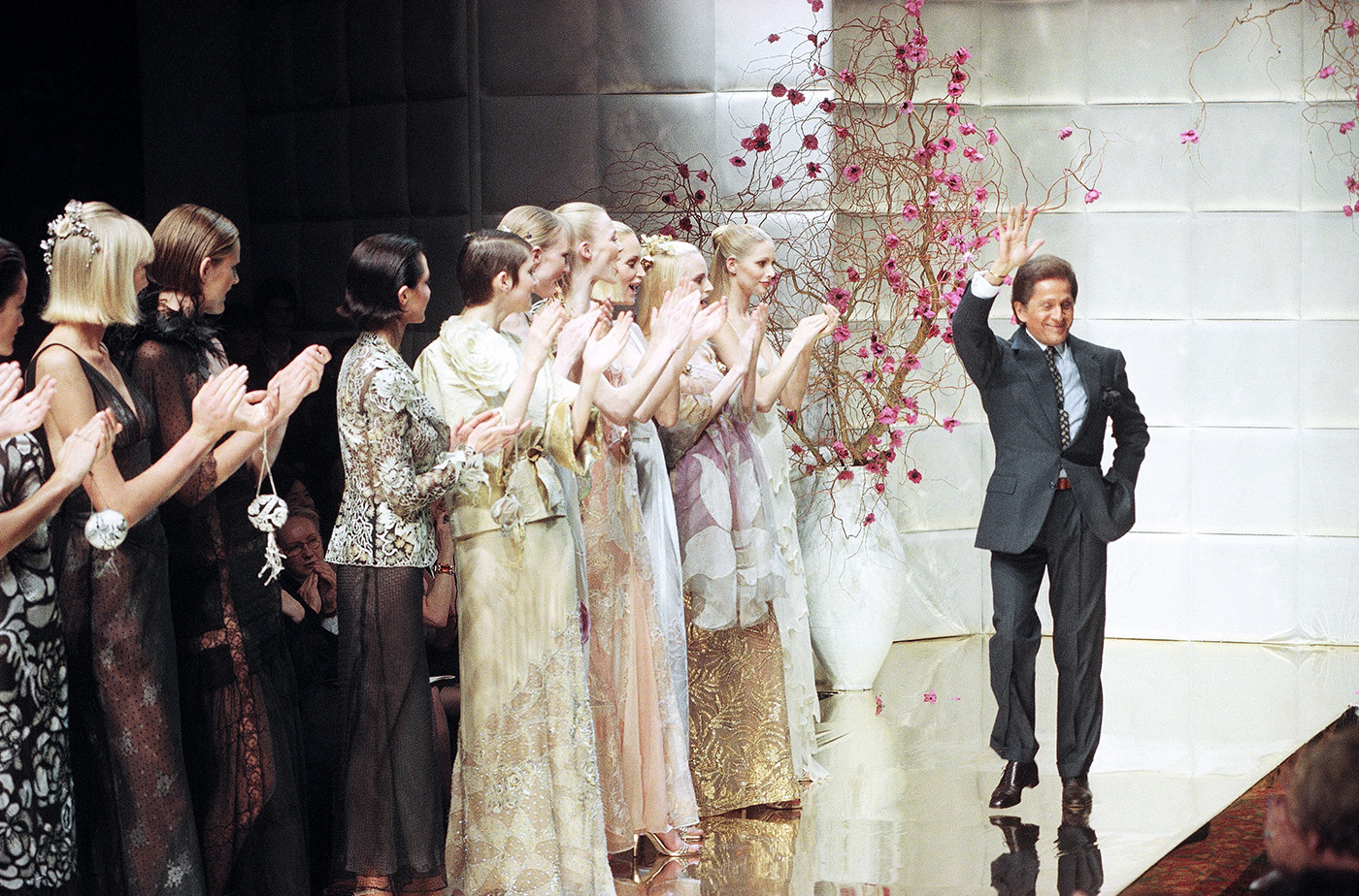 Итальянский модельер Валентино Гаравани принимает аплодисменты после презентации своей коллекции весна-лето 1997 года 22 января 1997 года в Париже, Франция