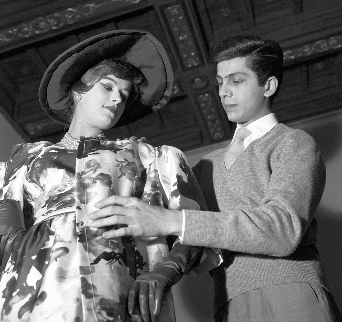 Итальянский модельер Валентино Гаравани готовит модель во время показа мод в своем ателье в Риме в 1959 году