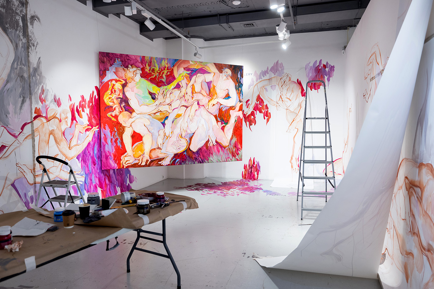 Инсталляция представляет собой объемную «фреску», где образы выходят за рамки холста на стены, создавая эффект слияния и распада тел, символизирующих вечную трансформацию и непостоянство истины. Центральное полотно создано в личном пространстве художницы, но окончательно обретет форму в галерее перед зрителями.