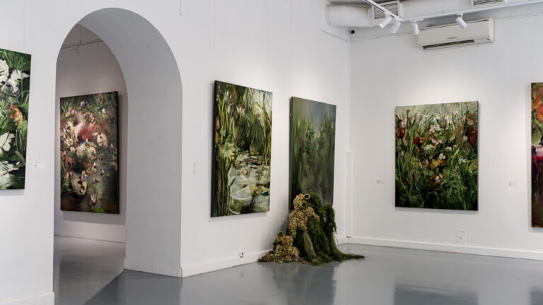 — Таша уже больше года работает над этой серией работ, и так как летняя серия получилась наиболее цельной по количеству работ, мы решили в середине лета сделать ей выставку — как раз о лете. Мы дополнили её ещё одной темой из серии «13 сезонов. Воды Миллюзины», так как в этой серии также были завершены все холсты, и мы решили её показать.