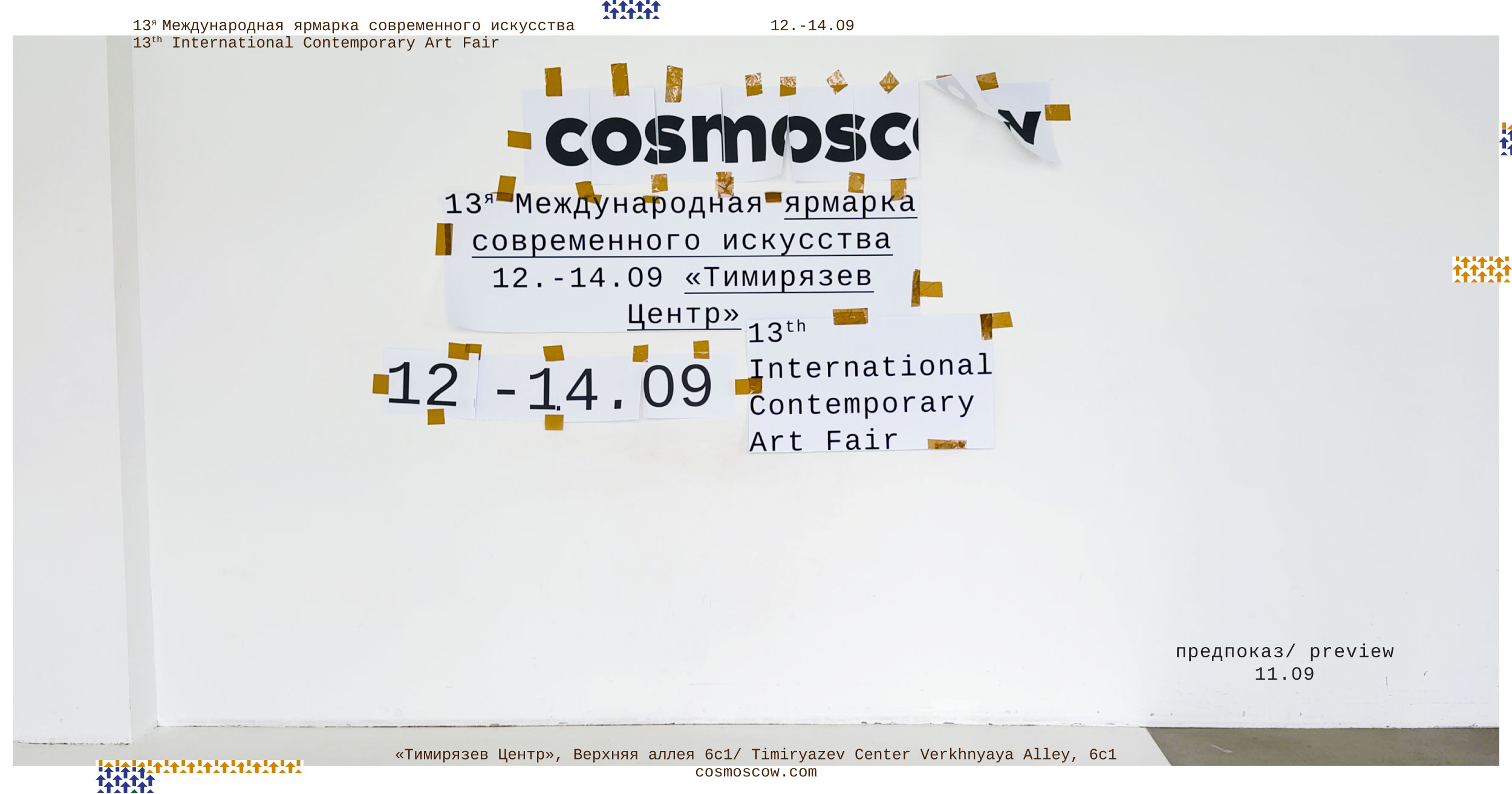 Визуальный стиль 13-й Международной ярмарки современного искусства Cosmoscow будет основан на идее временной фиксации — отсылая к репетиционной и монтажной природе экспозиционного пространства. Концепция разработана omsky studio и вдохновлена работами арт-группы «Промвыза», победителя программы «Художник года» 2025.