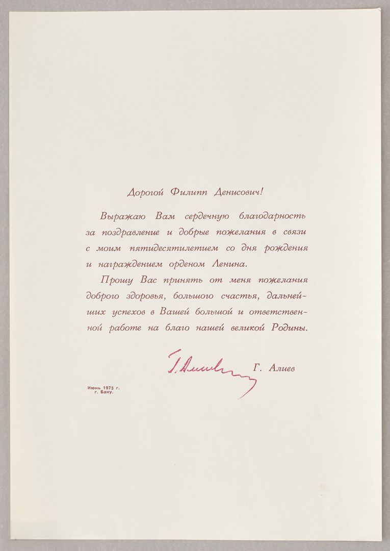 Аукционный дом «12й Стул» выставил на торги благодарственное письмо бывшего президента Азербайджана Гейдара Алиева, направленное первому заместителю председателя КГБ Филиппу Бобкову. В нем Алиев, возглавлявший в 60-е годы КГБ республики, благодарит за поздравления в связи с награждением орденом Ленина и желает генералу, наводившему «мистический ужас» на интеллигенцию, дальнейших успехов в работе «на благо нашей великой Родины».