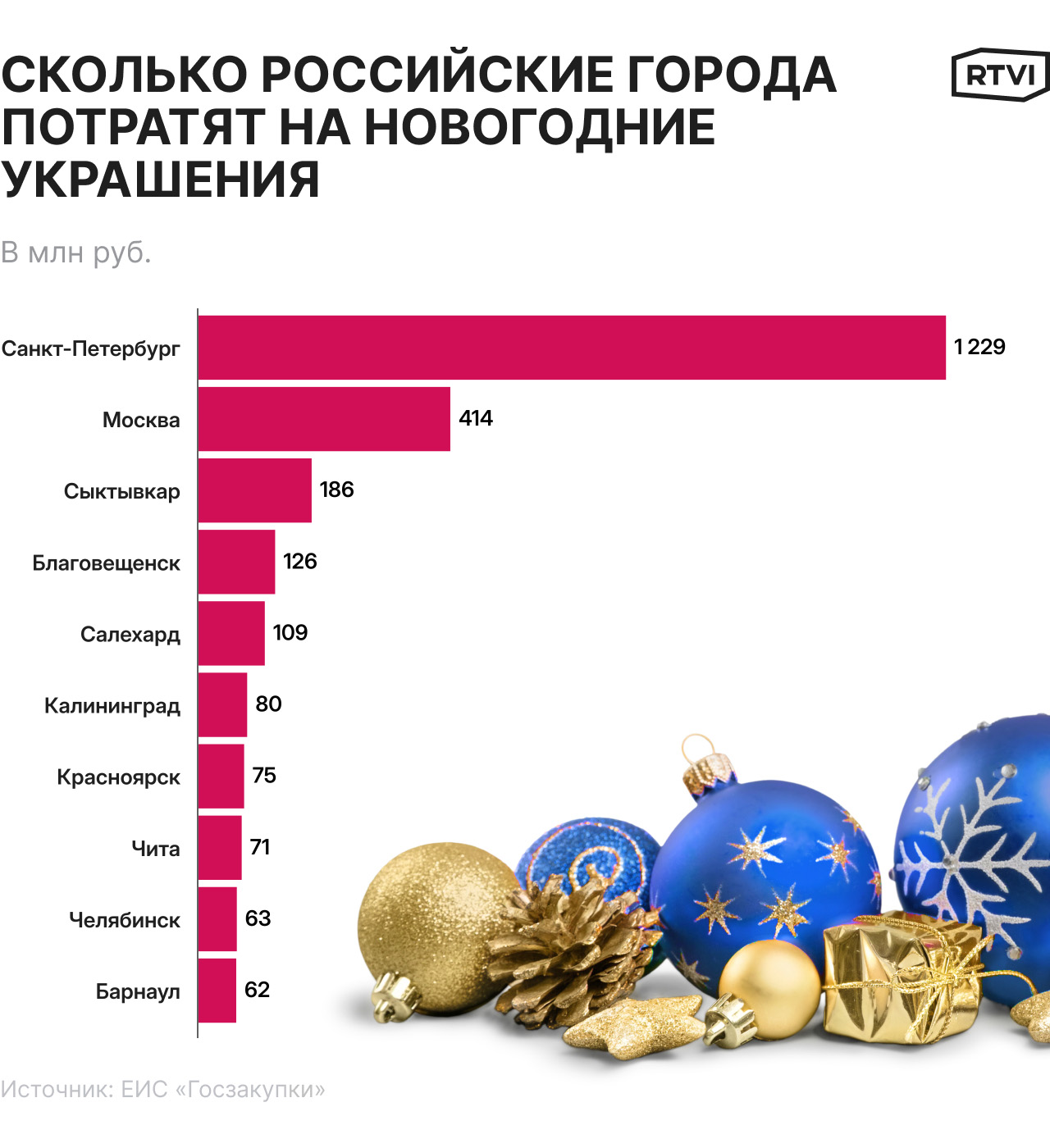 Третий год подряд лидером по средствам, затраченным на новогоднее украшение города, стал Санкт-Петербург: там праздничные расходы оказались в три раза выше (1229 млн руб), чем в Москве (414 млн руб.). RTVI совместно с проектом «Тендерскоп» изучил данные о закупках российских регионов и рассказывает о самых интересных из них.