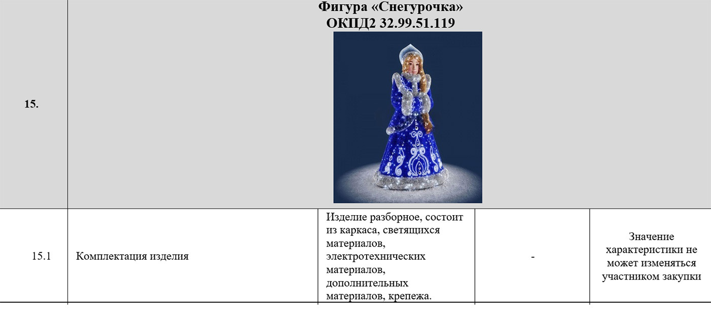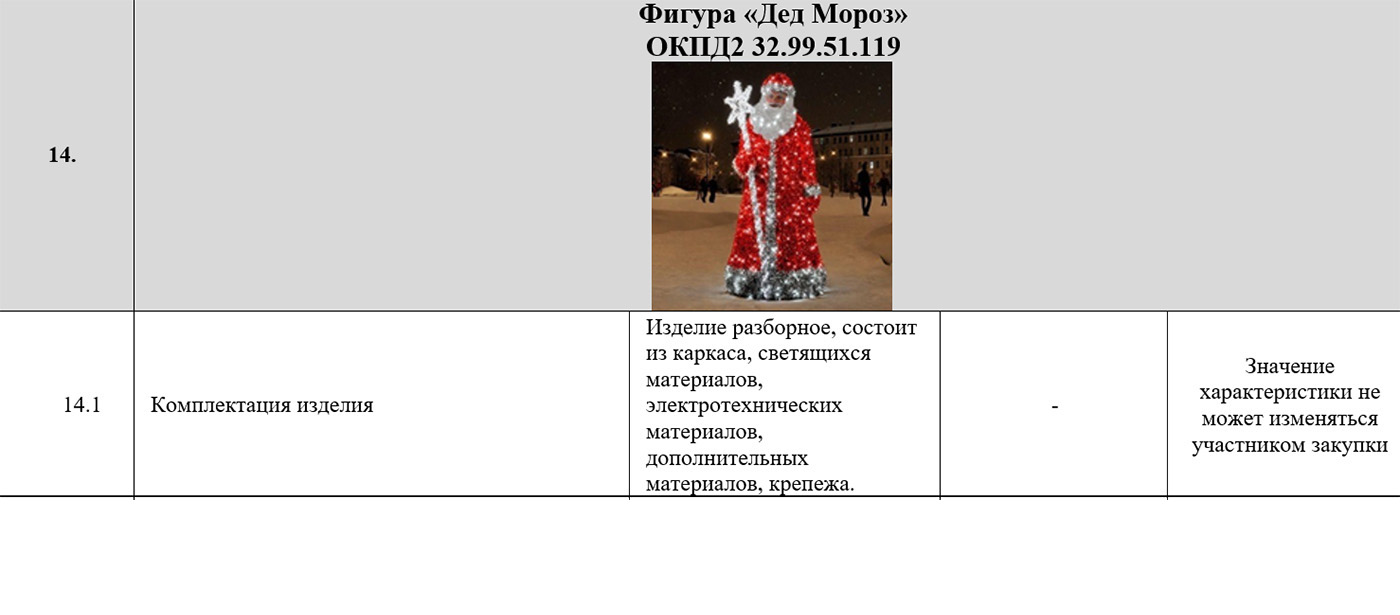 167 млн руб. стоила аренда изделий для новогодних и рождественских праздников. В техническом задании указаны арт-объект «Герб-Птица», «Фонарь Коми» и «Световые деревья», панель «Солнце севера», гирлянды «Тающие сосульки», арка «Коми», светодиодные шары и другие объекты с иллюминацией. Среди закупок — оформление и содержание «Новогодних городков», ремонт фигур из фанеры с героями сказок и мультфильмов, а также оформление катков.