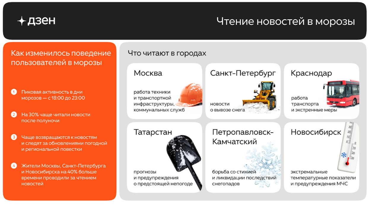 Аномальные морозы и снегопады в январе 2026 года привели к значительному росту времени, которое пользователи проводят за чтением новостей. Согласно исследованию аналитиков платформы «Дзен», в период экстремальных холодов жители России стали посвящать просмотру новостной ленты в среднем на 25% больше времени по сравнению с периодами умеренных холодов.