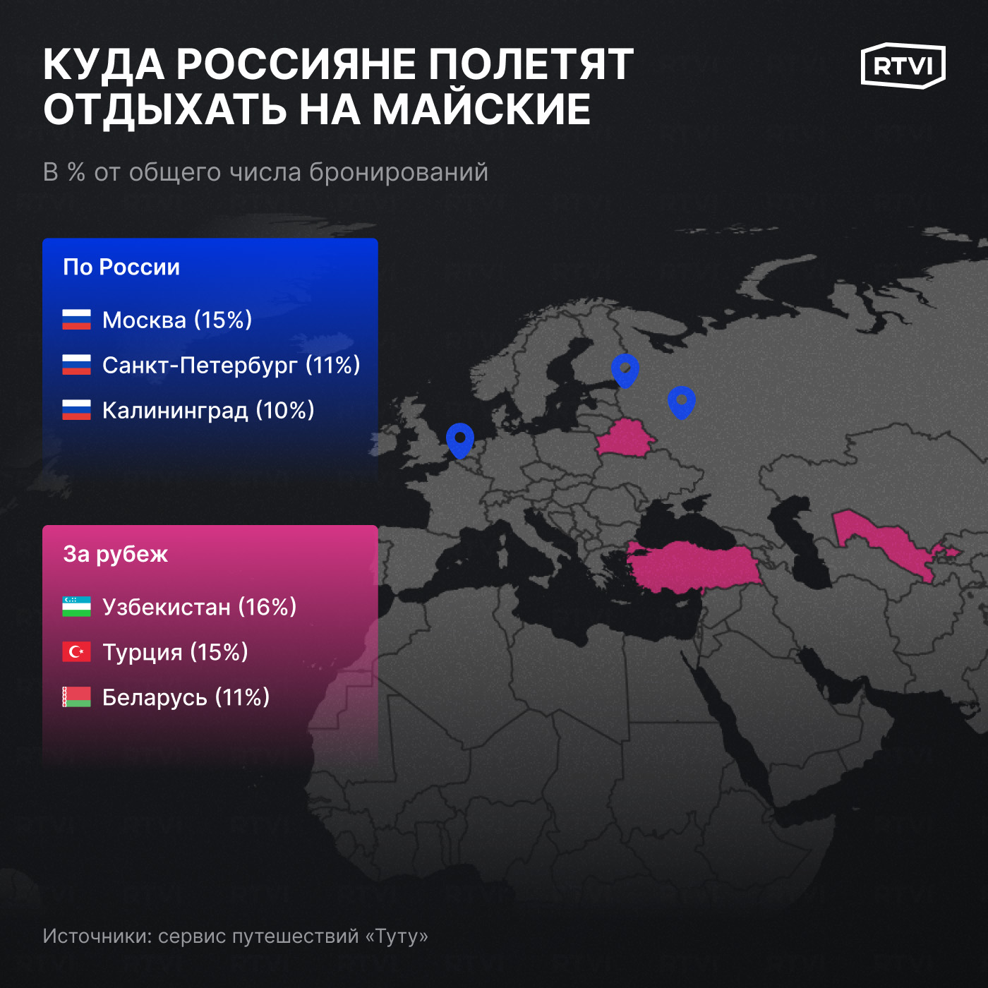 Также в «Туту» проанализировали, в каких городах россияне чаще всего бронируют отели на майские праздники. Здесь в топе оказались Петербург (25%), Москва (13%) и Казань (6%). За рубежом россияне чаще всего бронируют жилье в Беларуси (24%), Турции (23%) и Китае (8%).