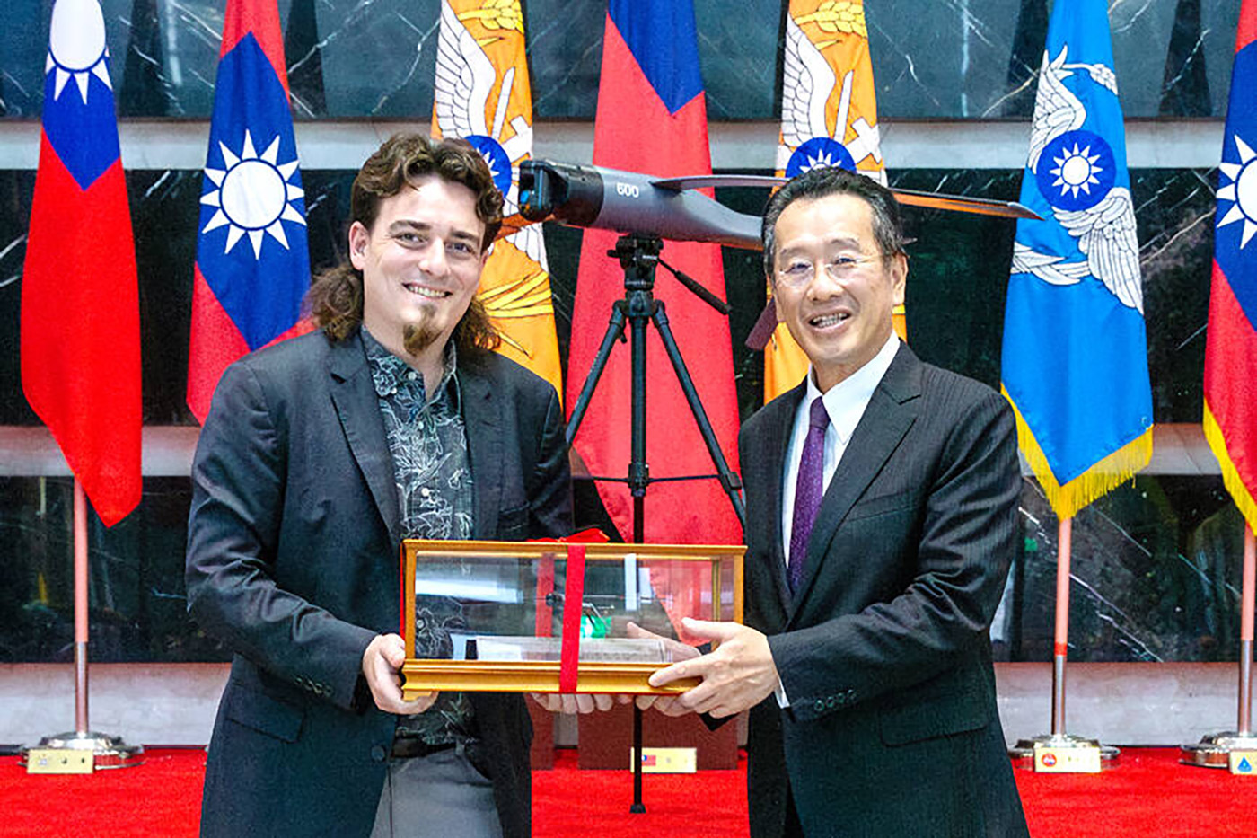 Основатель Anduril Industries Палмер Лаки (слева) представляет модель беспилотника министру национальной обороны Веллингтону Ку