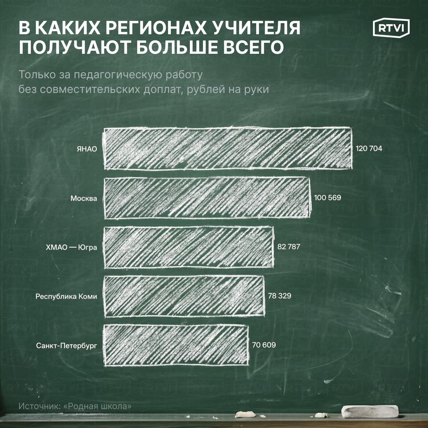 Самые большие зарплаты за педагогическую работу, по данным исследования, получают учителя Ямало-Ненецкого автономного округа, им платят 120,7 тыс. руб. на руки в месяц. Вторые по размеру зарплаты получают московские учителя — 100,5 тыс. руб.. Замыкает тройку лидеров Ханты-Мансийский автономный округ, здесь в месяц учителя получают 82,7 тыс. руб. В первую пятерку также вошли Республика Коми (78,3 тыс. руб. в месяц) и Санкт-Петербург (70,6 тыс. руб.).