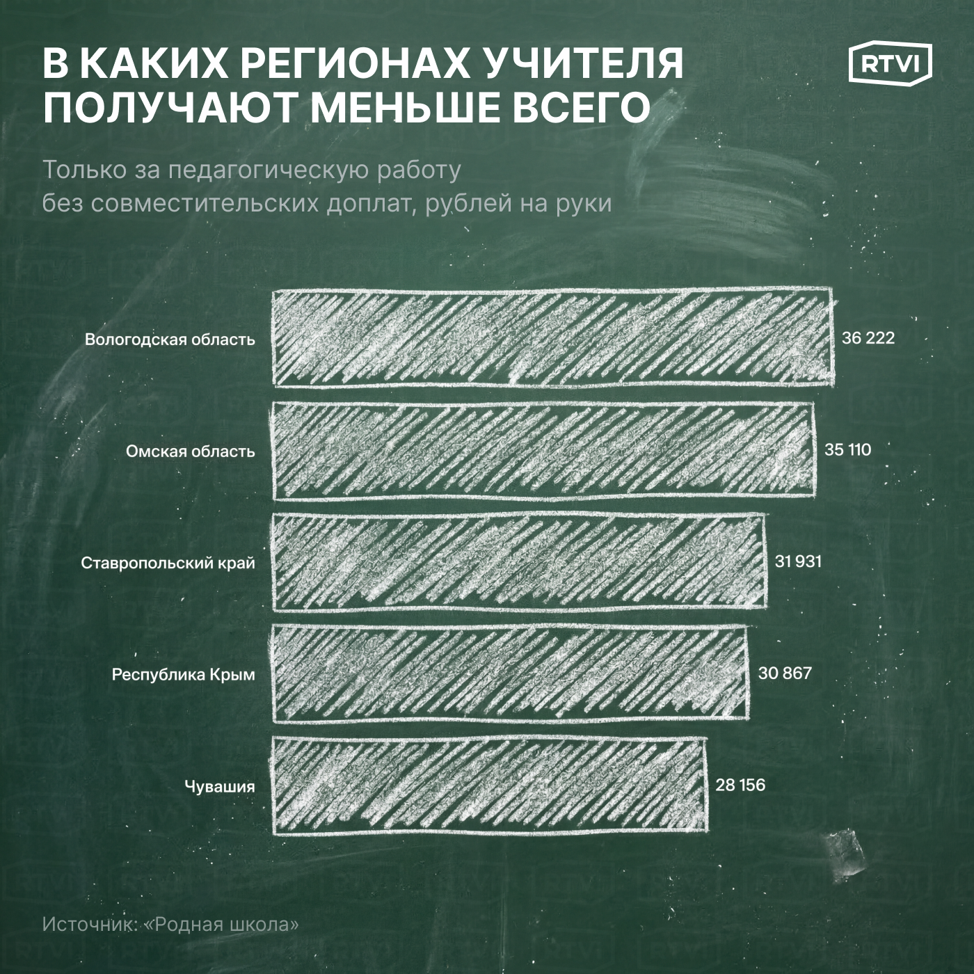 Меньше всего час работы учителя стоит в Ставропольском крае (113 руб. в час при нагрузке в 1,8 ставки), Омской области (120 руб. в час при нагрузке в 1,92 ставки), Чувашии (124 руб. в час при нагрузке в 1,4 ставки), Крыму (135 руб. в час при нагрузке в 1,46 ставки) и Ростовской области (147 руб. в час при нагрузке в 1,88 ставки).