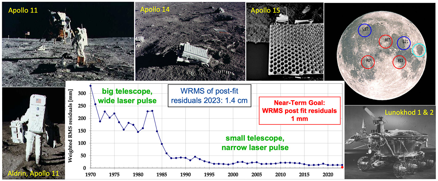 На борту советских луноходов и в местах посадок американских пилотируемых миссий на Луне в 1970-е годы были оставлены специальные научные приборы — так называемые панели лазерных уголковых отражателей, способных возвращать отправленный на них световой луч туда, откуда он пришел. Это позволило, отправляя с Земли на Луну импульсные сигналы лазера с высокой точностью определять расстояние до Луны и его изменения. В настоящее время при лазерной локации с американской обсерватории на Луну посылаются импульсы мощностью 1 Вт на длине волны 532 нанометра. При каждом импульсе к Луне отправляется 1018 фотонов, однако на подходе к Луне луч расширяется до 3 километров, отражается от панелей и возвращается на Землю, где регистрируется время прохождение до Луны и обратно (около 2.5 секунды). Из-за различных потерь наблюдатели на Земле регистрируют в среднем лишь 1 отраженный фотон на каждые сто отправленных импульсов.