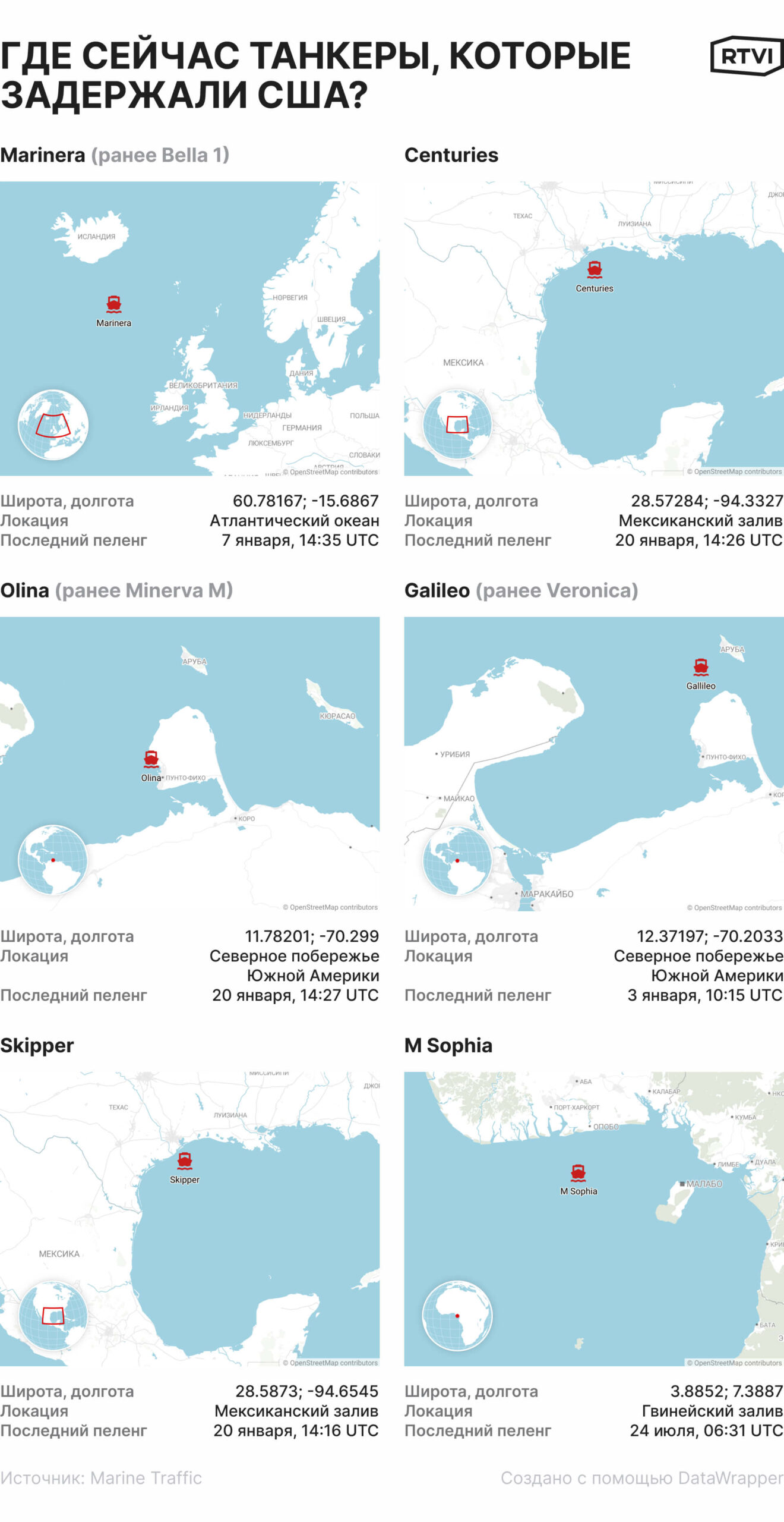 RTVI 21 января опубликовал инфографику, на которой было обозначено местонахождение задержанных США танкеров (с разной степенью актуальности информации).
