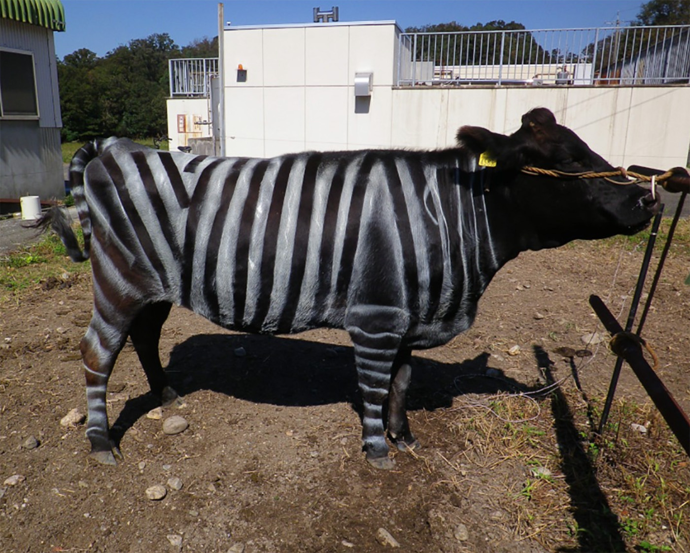 Ученые раскрашивали черных коров в белую полоску и сравнивали число садящихся на них мух с неокрашенными коровами. «Результаты показали, что раскрашивание такого скота как коровы в черно-белые полоски может предотвращать укусы мух», — говорится в исследовании, опубликованном в журнале PLoS ONE.