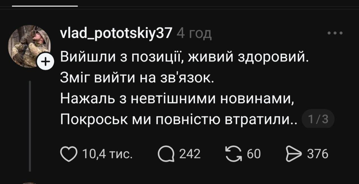 «Вышли с позиции, живы-здоровы. Смогли выйти на связь. К сожалению, с неутешительными новостями, Покровск мы полностью потеряли. Ситуация катастрофическая, проход, по которому можно отступить из Мирнограда, составляет примерно 1,8 км, это без серой зоны, при этом в районе Мирнограда и Ровного противник пытается еще больше сузить этот коридор», — пишет Потоцкий.