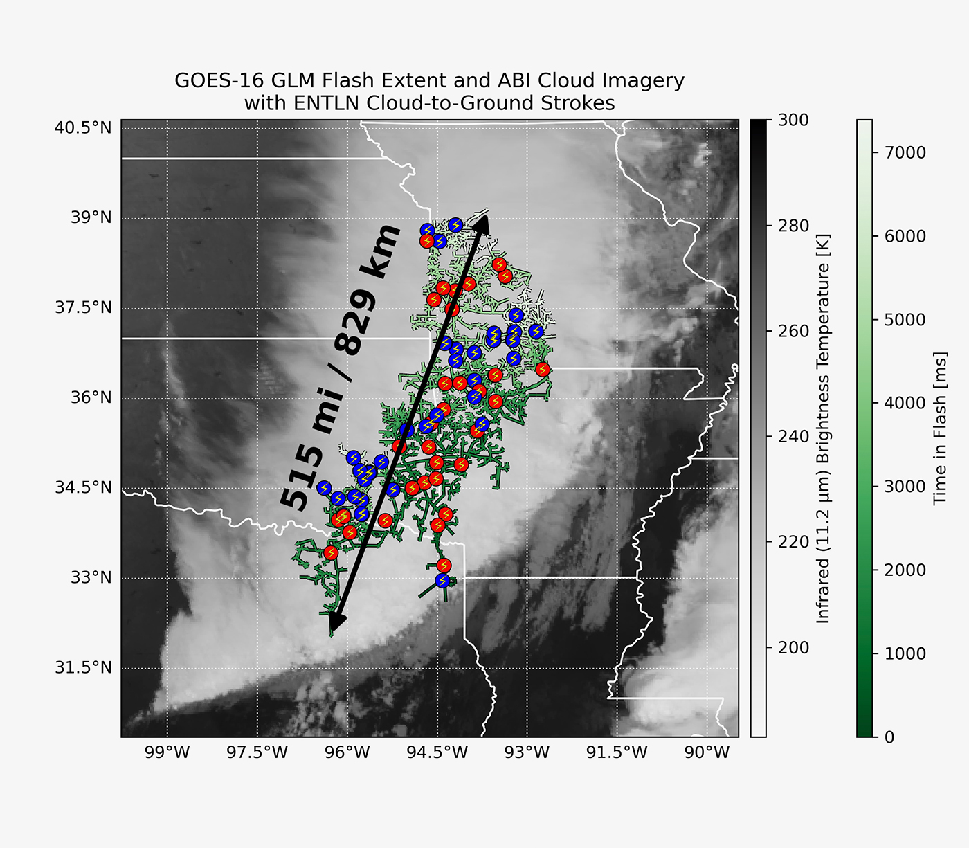 В США ученые разрегистрировали небывало длинный разряд молнии. Спутник зафиксировал этот разряд длиной 829 километров еще в 2017 году, однако известно об этом стало только теперь, при проверке архивных данных.
