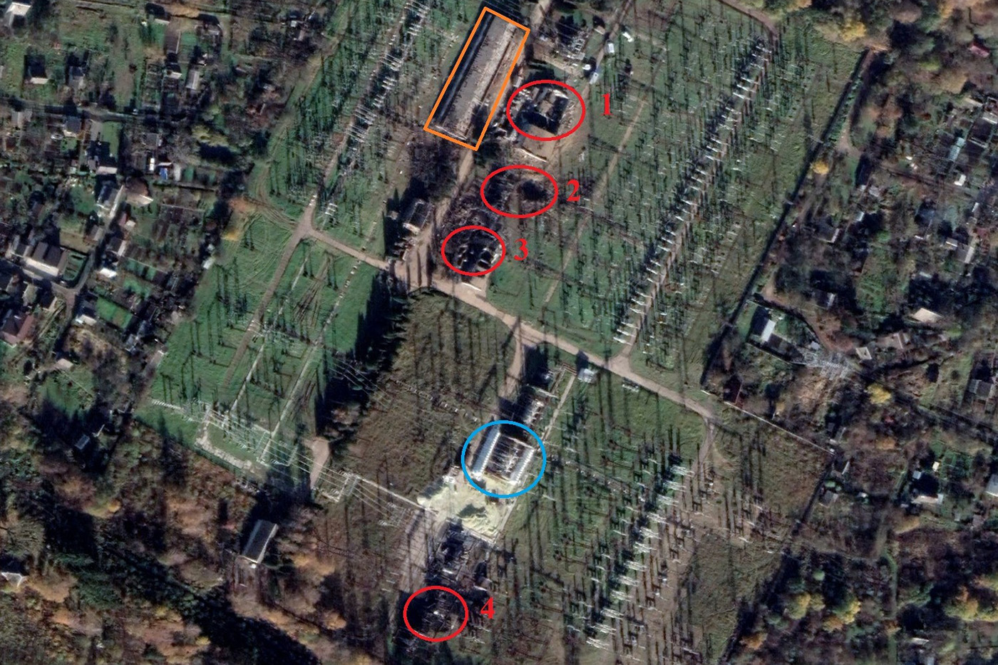 Стрельба по «сараям» ПС 330/220/110 кВ Львов-Южная (космоснимок от 28.10.2022): 1 — прямое попадание в ЗРУ 10 кВ, 2 — промах, ставший фатальным для автотрансформатора 220/110 кВ, 3 — прямое попадание в компрессорную, 4 — прямое попадание/близкий разрыв с автотрансформатором 330/220 кВ (на Украине таковых было менее десятка), повреждён, скорее всего, и соседний автотрансформатор 330/110 кВ. Рыжее — посечённое осколками ОПУ. Голубым цветом обведен срочно обмешкованный автотрансформатор 330/110 кВ.