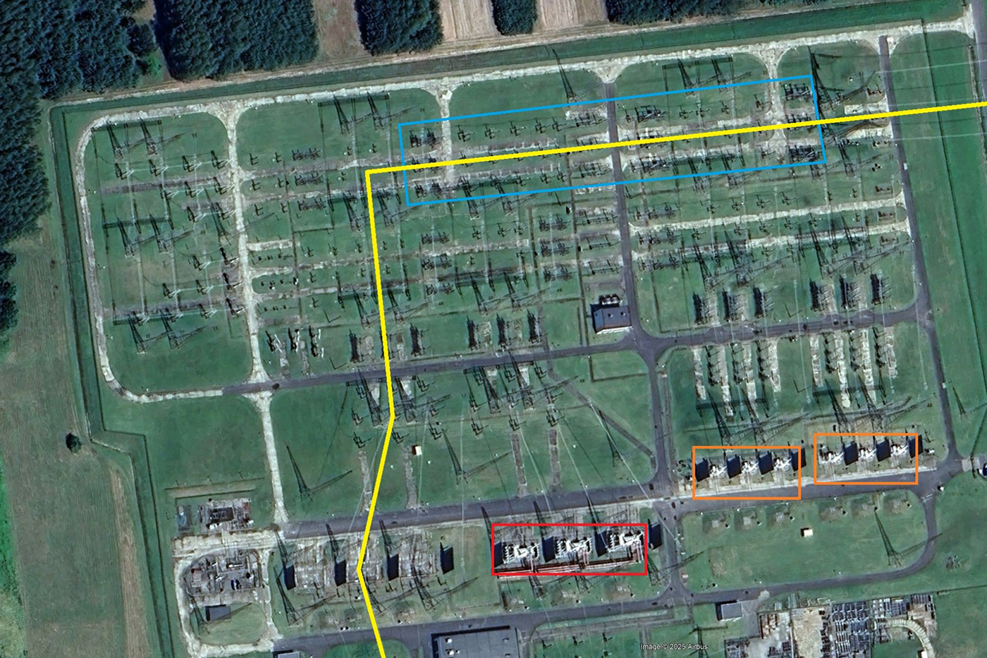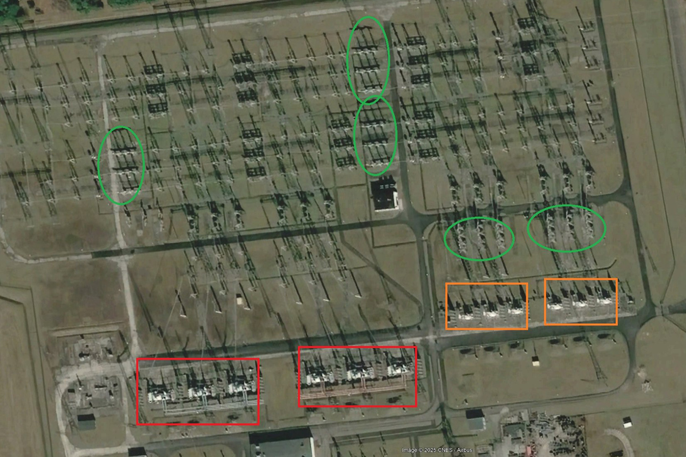 ПС Жешув в 2020 г. До СВО это небольшая, но полностью рабочая ПС с двумя автотрансформаторными группами (обведено красным) 750/400 кВ, двумя группами шунтирующих реакторов (ШР, обведено оранжевым), пятью выключателями (обведено зелёным) и прочим оборудованием.