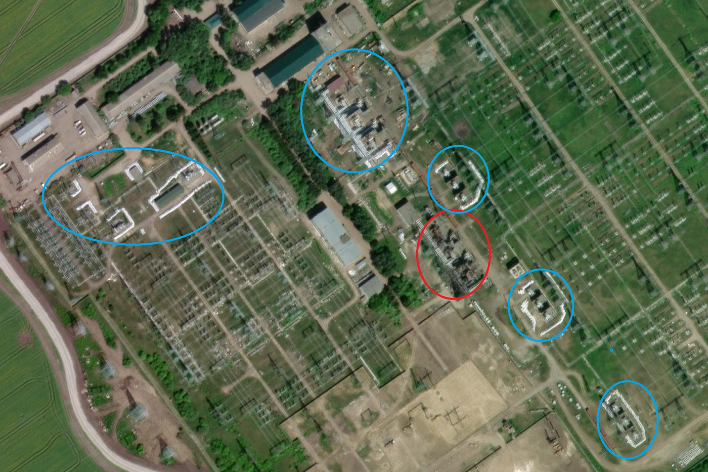Космоснимок ПС 750 кВ Винница-750 (скорее всего, лето 2023 года). Хорошо видна сгоревшая автотрансформаторная группа 750/330 кВ (красное) и обмешкованное оборудование (вторая группа, шунтирующие реакторы и прочее)