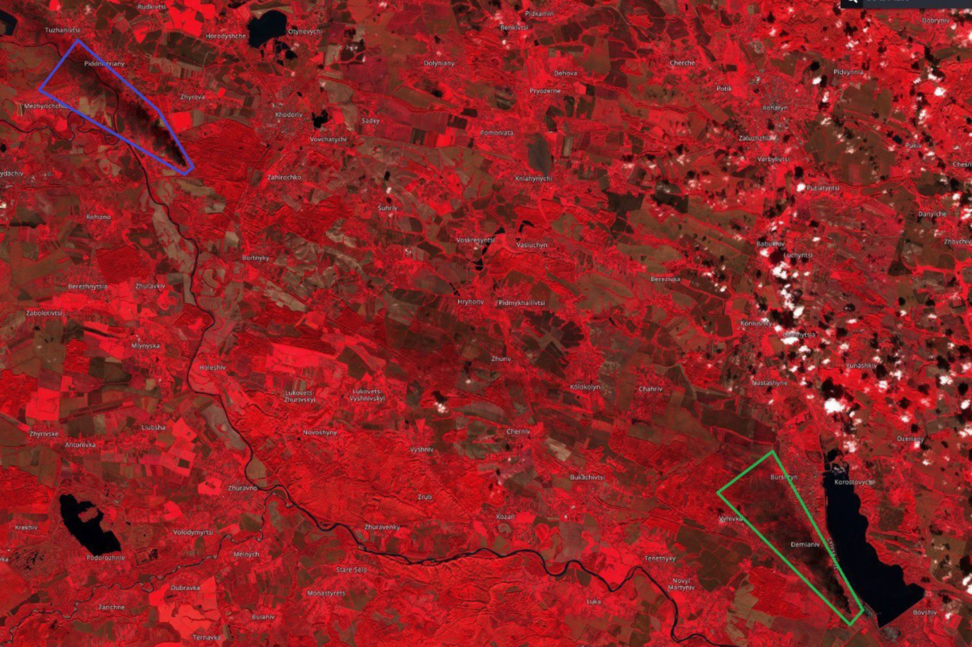 Космоснимок от 10.10.2022. На северо-западе (синее) горит автотрансформаторная группа 750/330 кВ на ПС 750 кВ Западноукраинская, на юго-востоке (зелёное) — автотрансформаторная группа 400/330 кВ на Бурштынской ТЭС
