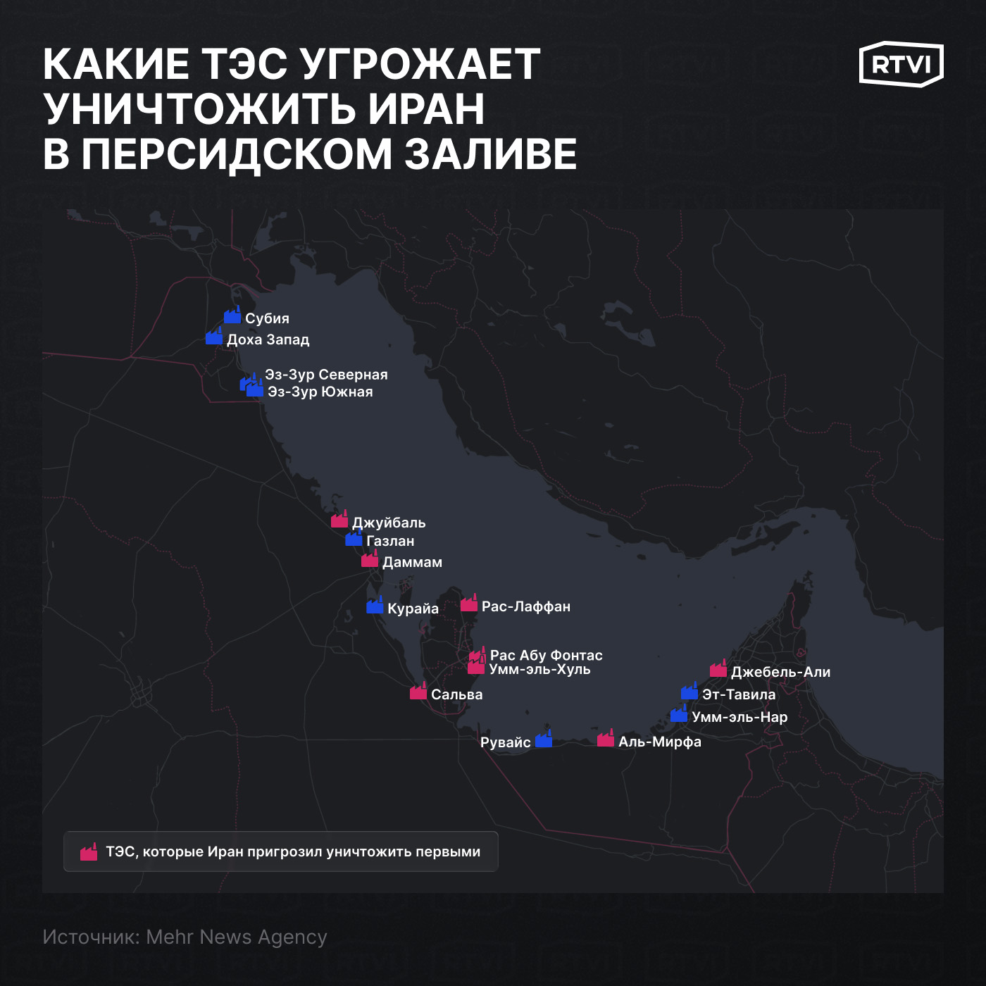 Всего на противоположном Ирану побережье находятся как минимум 17 ключевых ТЭС. Из них восемь были обозначены Эбрахимом Зольфагари в качестве законных целей.
