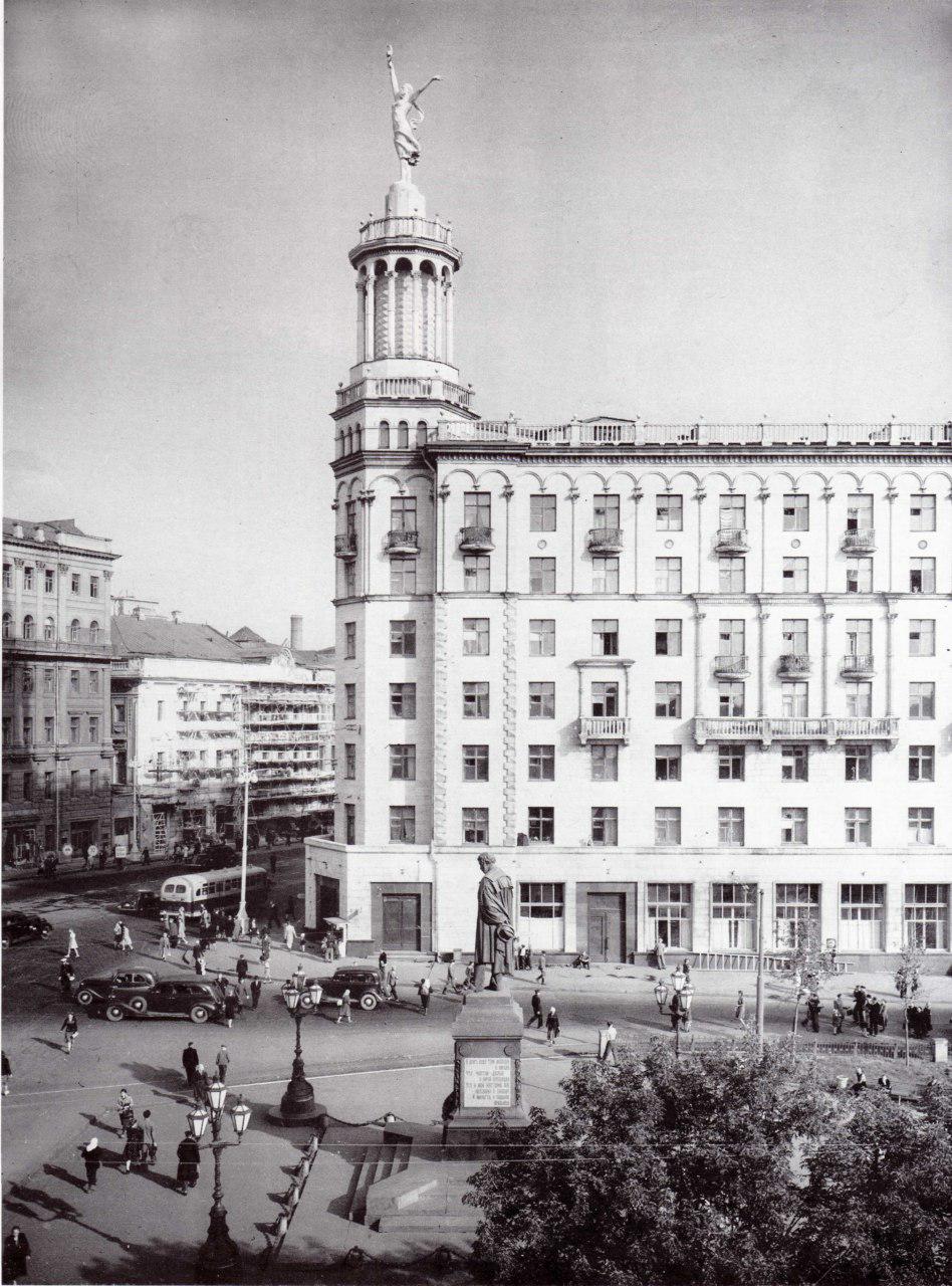 Жилое здание на углу Тверской улицы и Тверского бульвара было построено в конце 1930-х годов на месте снесенного храма Дмитрия Солунского. Авторы проекта — архитектор Аркадий Мордвинов и инженер Петр Красильников украсили дом башенками, эркерами, наличниками, балконами и аркой-проездом.