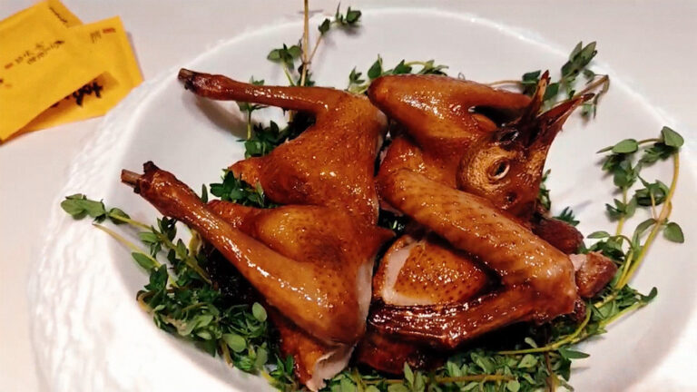 Но, если просто пожарить тушку на сковородке, получится невкусно, поэтому в Гуандуне голубей готовят особым образом. Сначала птицу тушат в ароматном бульоне с соевым соусом, рисовым вином, имбирём и другими специями и пряностями, потом обливают сладким соусом, подвешивают и обдувают вентилятором от 4 до 8 часов — все эти манипуляции нужны ради супер-хрустящей корочки. Затем голубя опускают в фритюр: сначала жарят на низкой температуре, чтобы прогрелось мясо, потом на высокой — для хруста и золотистого цвета шкурки. Подают целиком — прямо с головой, которую тоже можно (и нужно) съесть.