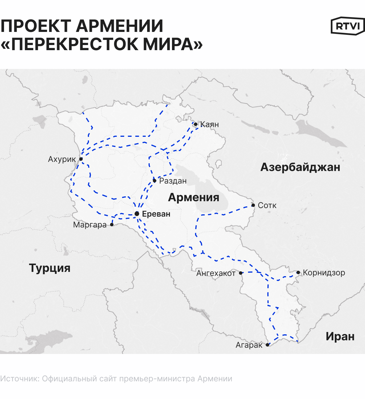 Более того, проект предполагает строительство, восстановление и использование инфраструктуры на других логистических маршрутах, которые позволили бы соединить коммуникации между Арменией и ее четырьмя соседями: Турцией, Азербайджаном, Ираном и Грузией.