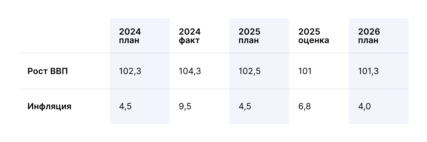 На 2025 год был запланирован рост ВВП в размере 102,5% при инфляции 4,5%. Экономический маневр правительства и ЦБ заключался в том, чтобы пожертвовать темпами экономического роста в целях подавления инфляции. Маневр, к сожалению, не удался, что предсказывали многие экономисты, в том числе и я.