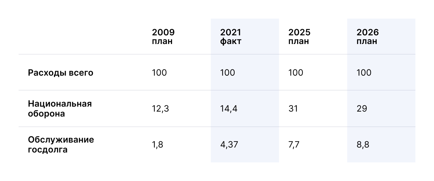 Кроме того, перевооружение армии дает мощный импульс одному из приоритетов бюджетной политики — технологиям. Однако расходы на национальную оборону — отнюдь не единственная быстрорастущая статья бюджета. С 2021 по 2026 год расходы на обслуживание долга росли сравнимыми темпами. Но, если сравнить с 2009 годом, то доля расходов на национальную оборону увеличилась в 2,35 раза, а доля расходов на обслуживание долга — практически в 5 раз.