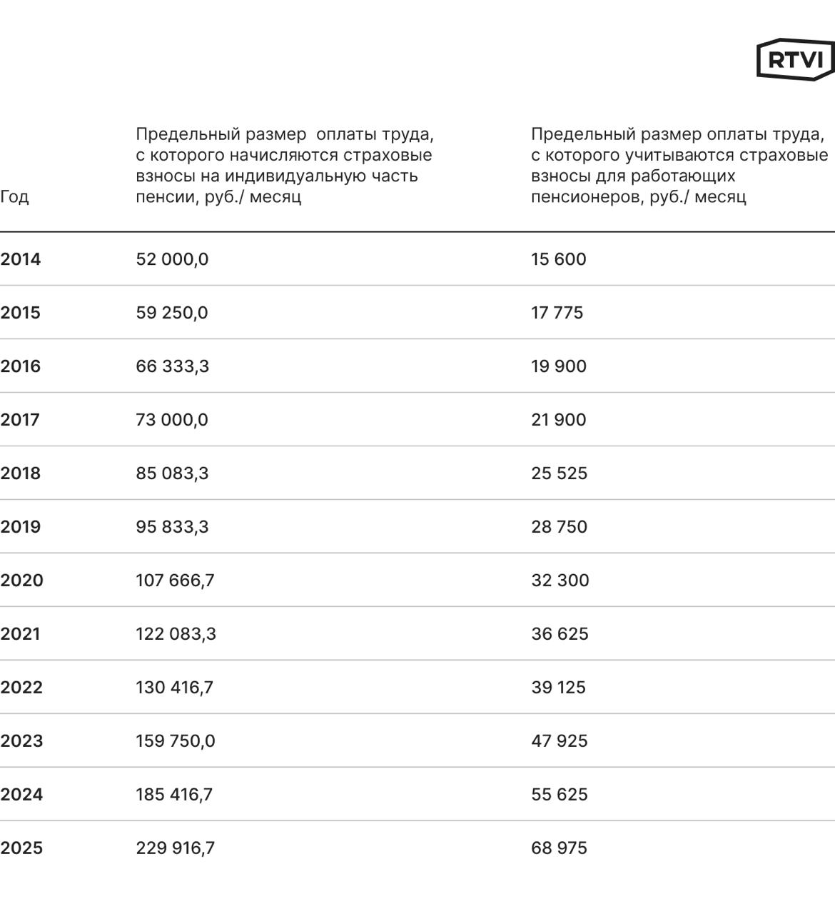 Первая ошибка, которая дезинформирует работающих пенсионеров, состоит в том, что им якобы будет начисляться десять ИПК (индивидуальных пенсионных коэффициента) при получении предельного уровня заработной платы для уплаты ежемесячных взносов в пенсионный фонд, равной в 2025 году 230 тысячам рублей. Зарабатывать они реально могут и 230 тысяч, и более и платить взносы с этих средств в социальный фонд. Но учитываться при перерасчете пенсии будут только взносы, уплаченные по заработной плате до 68975 рублей в месяц, эквивалентные трем ИПК, поскольку именно такое ограничение было введено в 2015 году, и пока, несмотря на все наши усилия, не снято. Поэтому в таблице ниже я привожу сопоставление предельного размера оплаты труда, с которого уплачиваются взносы, и предельный размер оплаты труда, с которого уплаченные взносы учитываются для работающих пенсионеров.