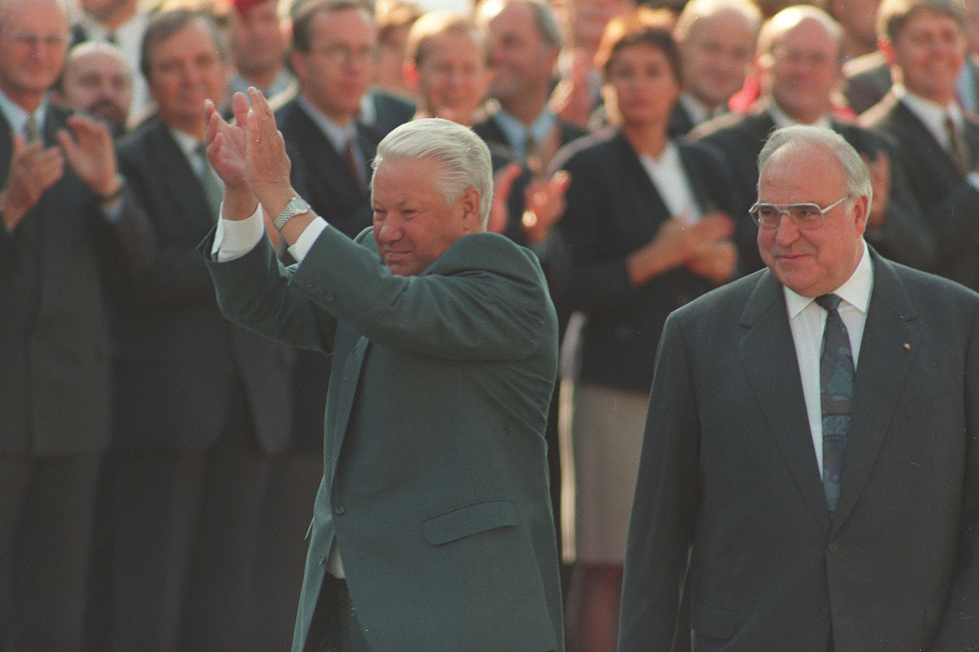 Президент РФ Борис Ельцин и канцлер ФРГ Гельмут Коль во время торжественных мероприятий в Берлине по случаю завершения вывода Западной группы войск из Германии. 31 августа 1994 года
