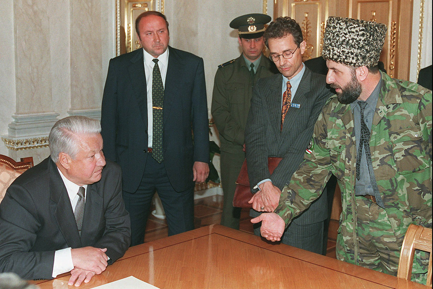 Борис Ельцин встречается в Кремле с чеченской делегацией во главе с Зелимханом Яндарбиевым, 1996 год