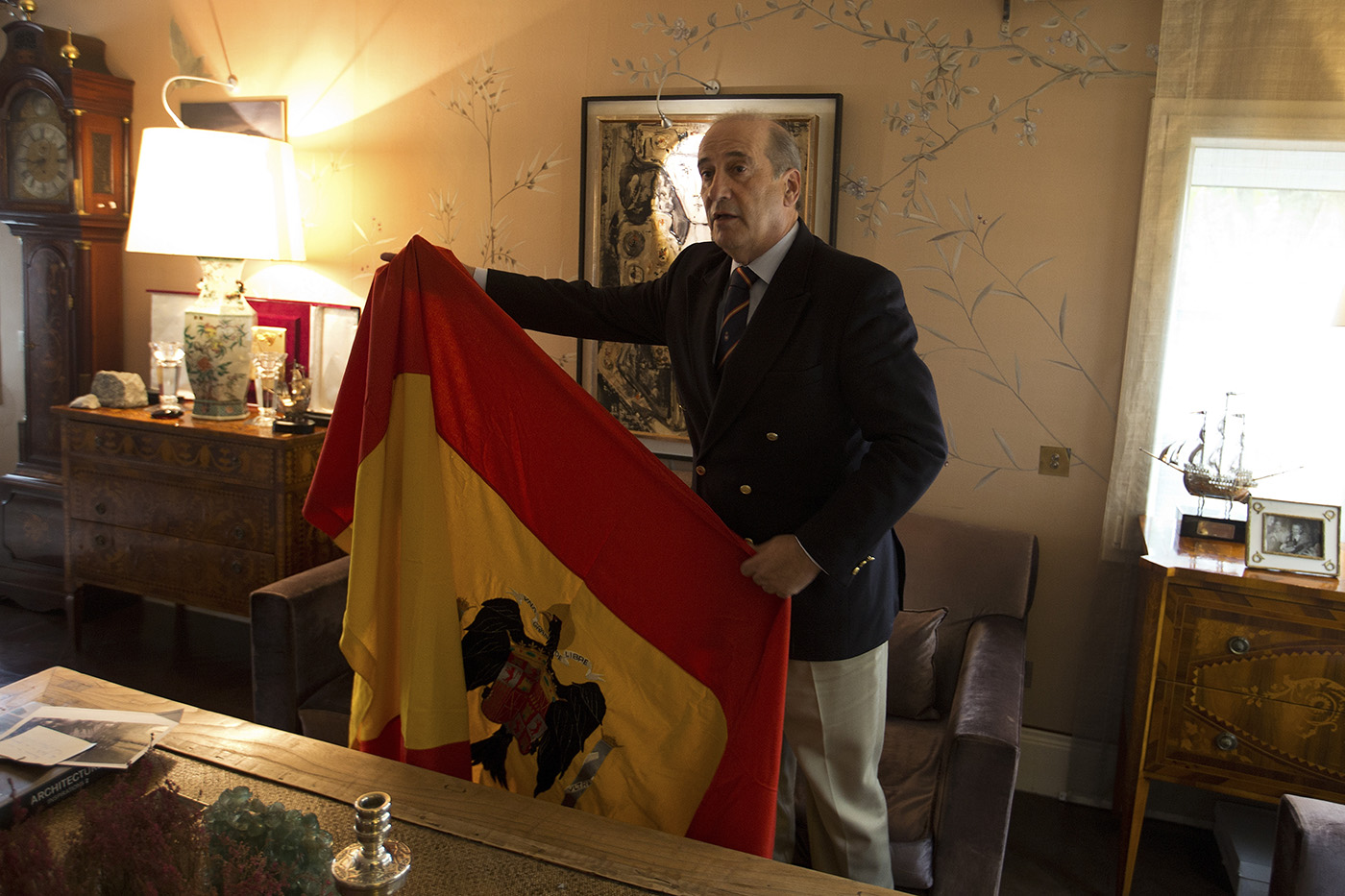 Внук испанского диктатора генералиссимуса Франсиско Франко, Франсиско Франко Мартинес-Бордиу, держит в руках прежний флаг Испании, которым он хочет накрыть гроб деда во время его перезахоронения.